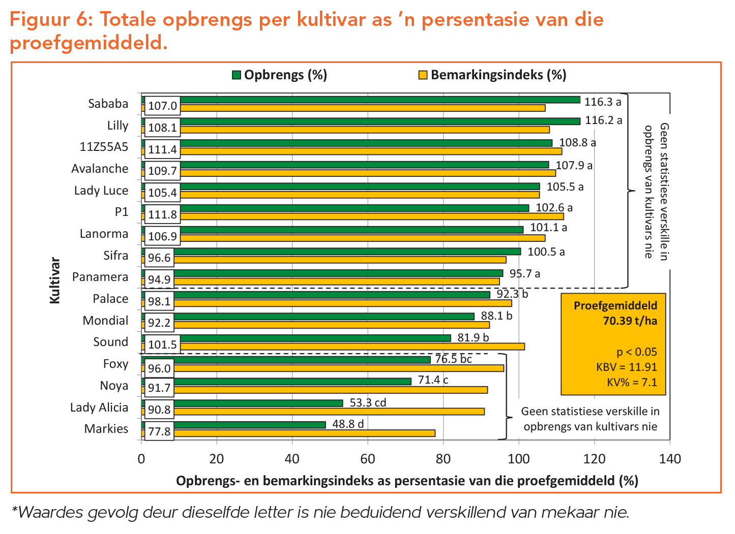 Hierdie faktore dui daarop dat die proef baie goed uitgevoer is en die resultate dus betroubaar is. Die opbrengs van elk van die kultivars word deur die proefgemiddeld gedeel, met die proefgemiddeld van al die kultivars wat as 100% geneem word. Hierdeur word ’n opbrengsindeks bepaal en word elke kultivar se prestasie in terme van opbrengs as ’n persentasie van die proefgemiddeld gelees.