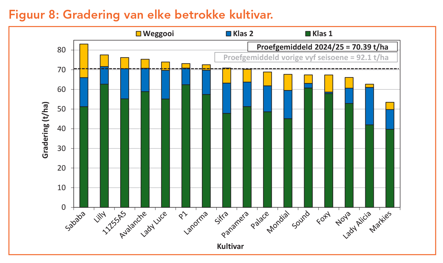 Groottegroepverspreiding en gradering is veelseggende evaluasies wanneer gekyk word na ’n kultivar se bemarkbaarheid (Figuur 7 en 8). In hierdie proef is slegs Klas 1- en 2-aartappels geklas, teenoor onbemarkbare (weggooi) aartappels.
