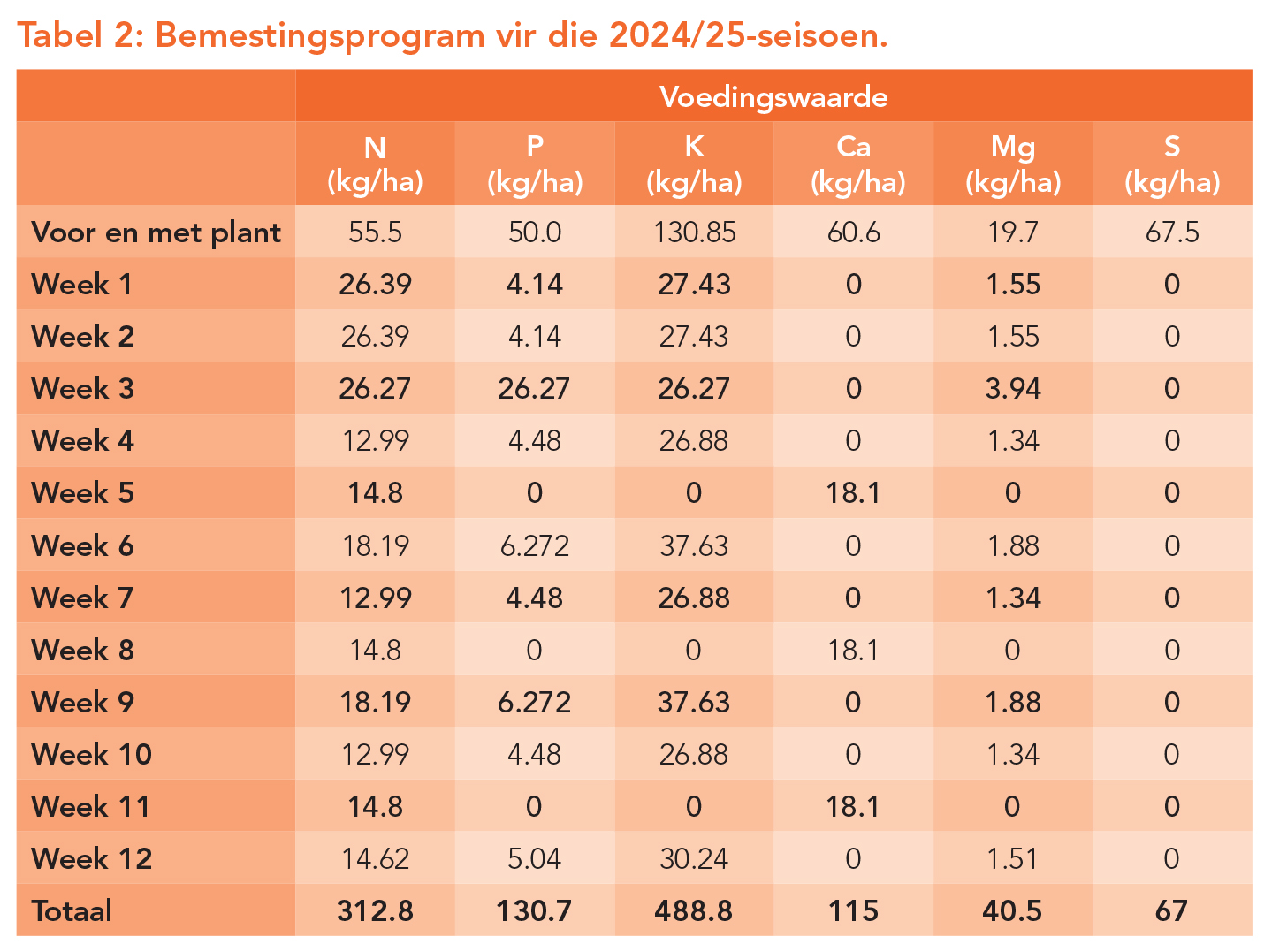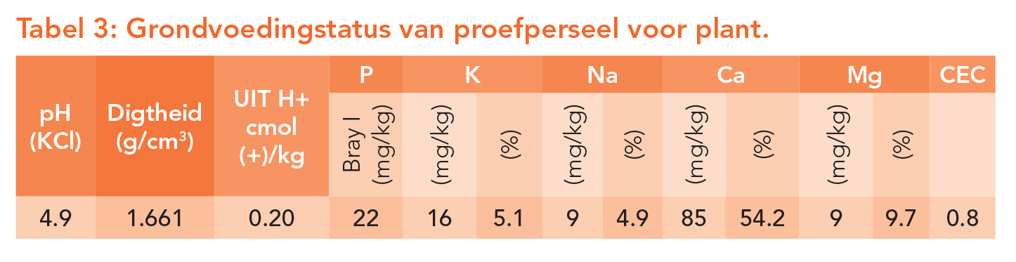 Tabel 2 vervat die bemestingsprogram vir die afgelope seisoen. Grondmonsters is voor plant geneem om die proefperseel se grondvoedingstatus te bepaal (Tabel 3). Regstellings aan die spilpunt is op ’n wisselende basis gedoen.