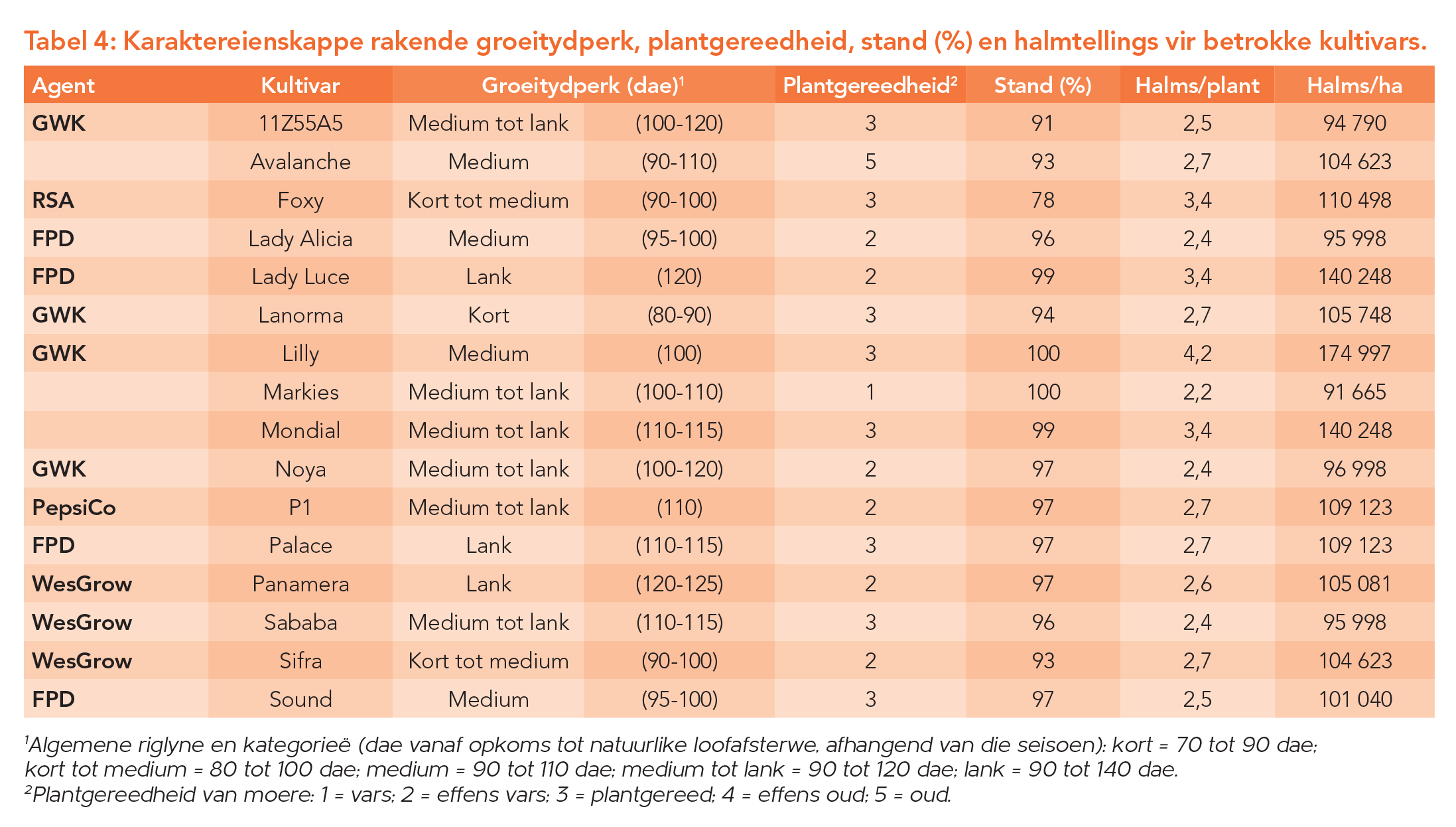 Ingesluit in die kultivarproef is kultivars met kort en lang groeitydperke wat die uiteindelike opbrengs van sekere kultivars beïnvloed. Die lengte van groeitydperke is aan die aard van die seisoen onderhewig, maar word gesien as die hoeveelheid tyd wat verloop vanaf opkoms tot natuurlike loofafsterwe. Tabel 4 sit uiteen hoe hierdie groeitydperke van kultivar tot kultivar verskil. Plantgereedheid van moere ten tyde van die plant van die proef, sowel as standpersentasie en halmtelling wat later in die groeitydperk waargeneem is, word in Tabel 4 aangedui.
