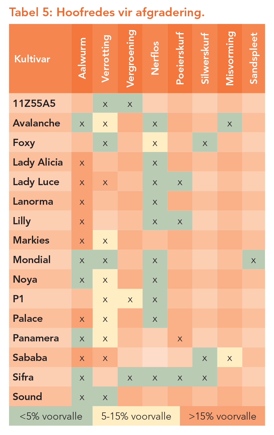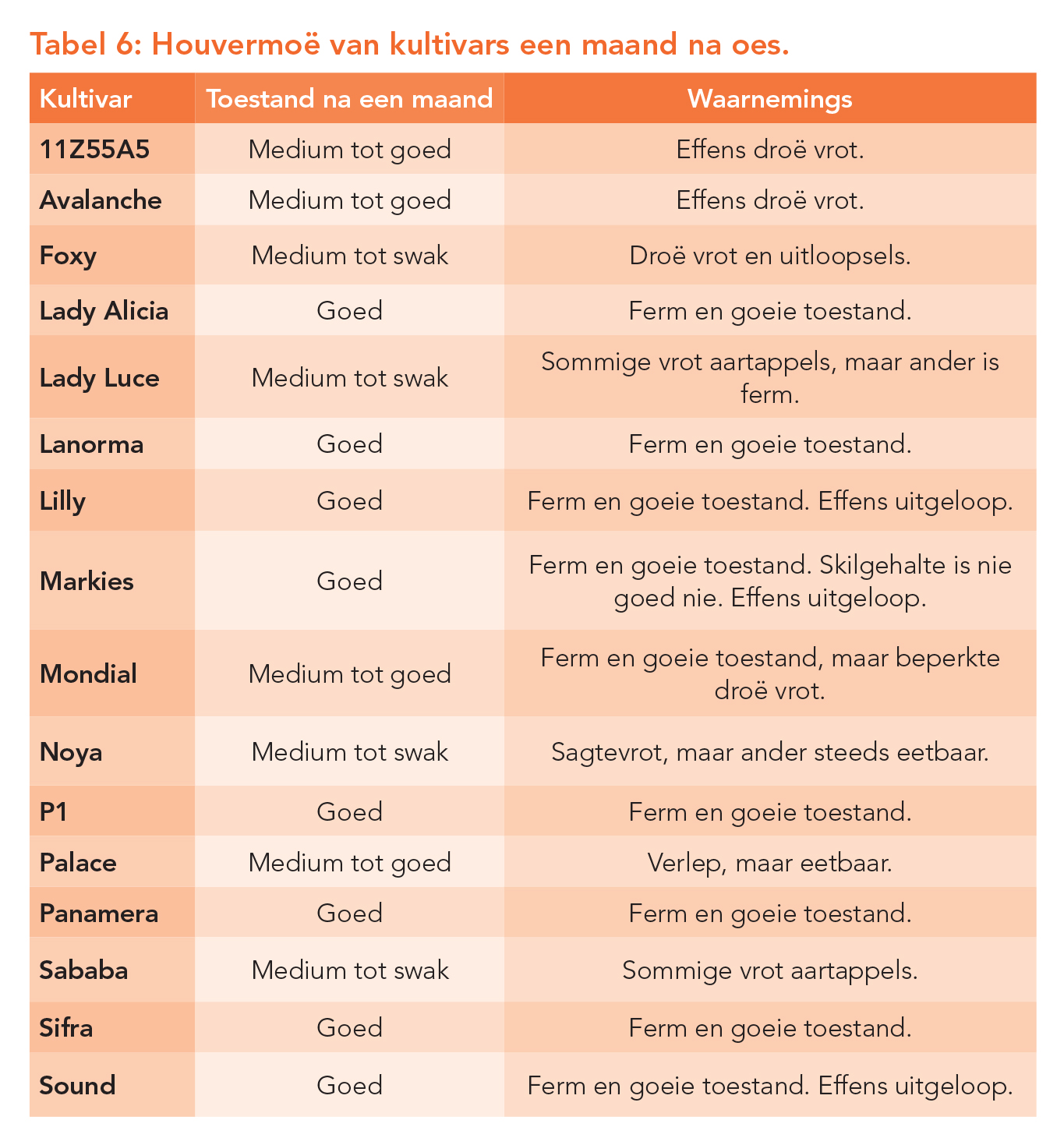 Die hoofredes vir afgradering word in Tabel 5 aangedui. Aalwurm, losskil en verrotting (bederf) was die grootste redes vir die afgradering van aartappels vanaf bemarkbaar na weggooi. Houvermoë is informeel ’n maand ná oes geëvalueer, en waarnemings van kultivartoestande word in Tabel 6 uiteengesit.