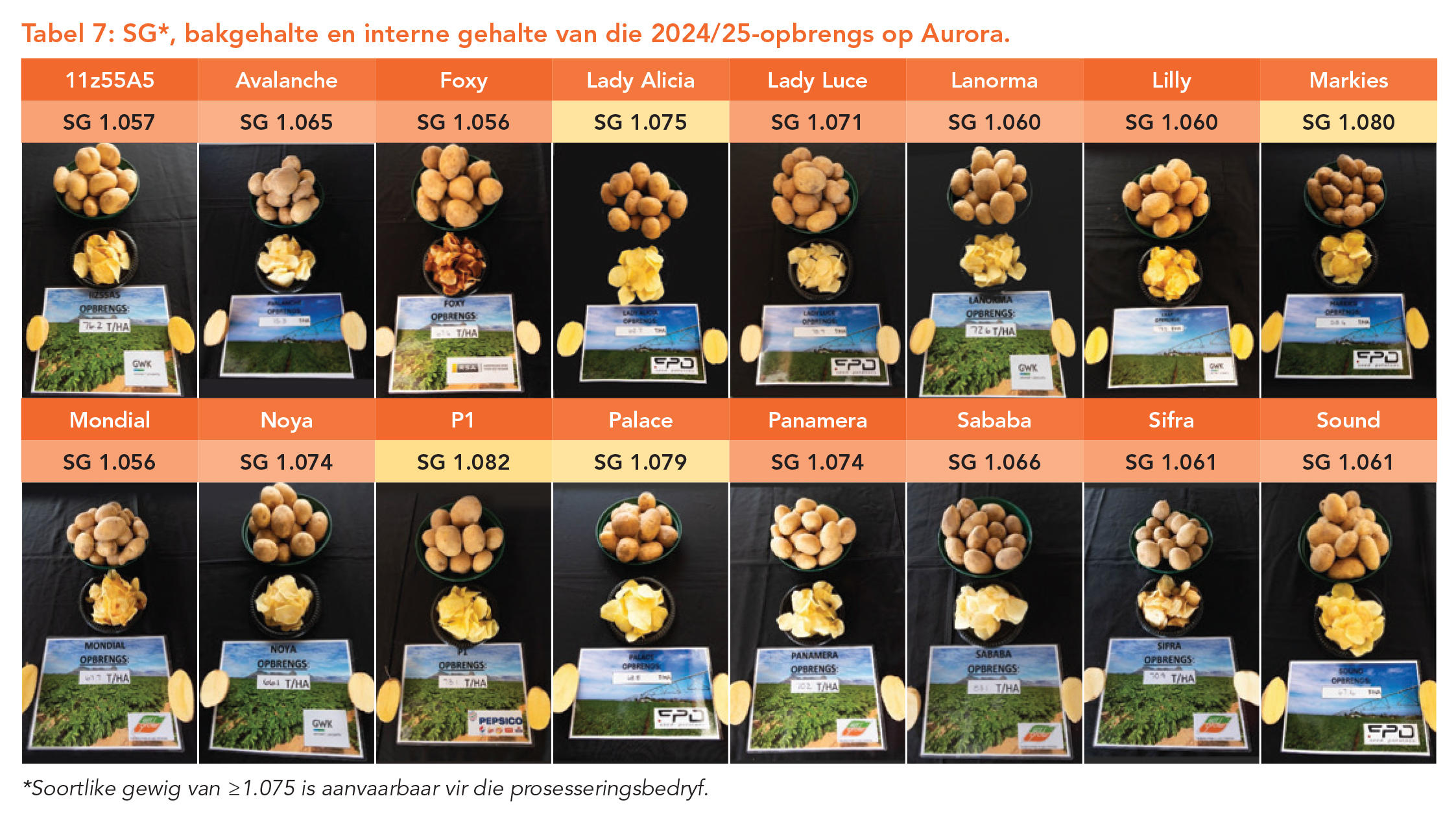 Laastens, wanneer gekyk word na die interne gehalte van aartappels, kan prosesseringseienskappe ook geëvalueer word. Om aan prosesseringsvereistes te voldoen, moet kultivars onder andere aan ’n soortlike gewig (SG) van ≥1.075 voldoen (Tabel 7). Lady Alicia, Markies, P1 en Palace het elkeen aan die SG-vereiste voldoen. Tabel 7 toon ook die betrokke kultivars se interne vleeskleur en bakgehalte. – Enrike Verster, Aartappels SA, Piet Brink, Sandveld-werkgroep en Albert de Villiers, produsent
