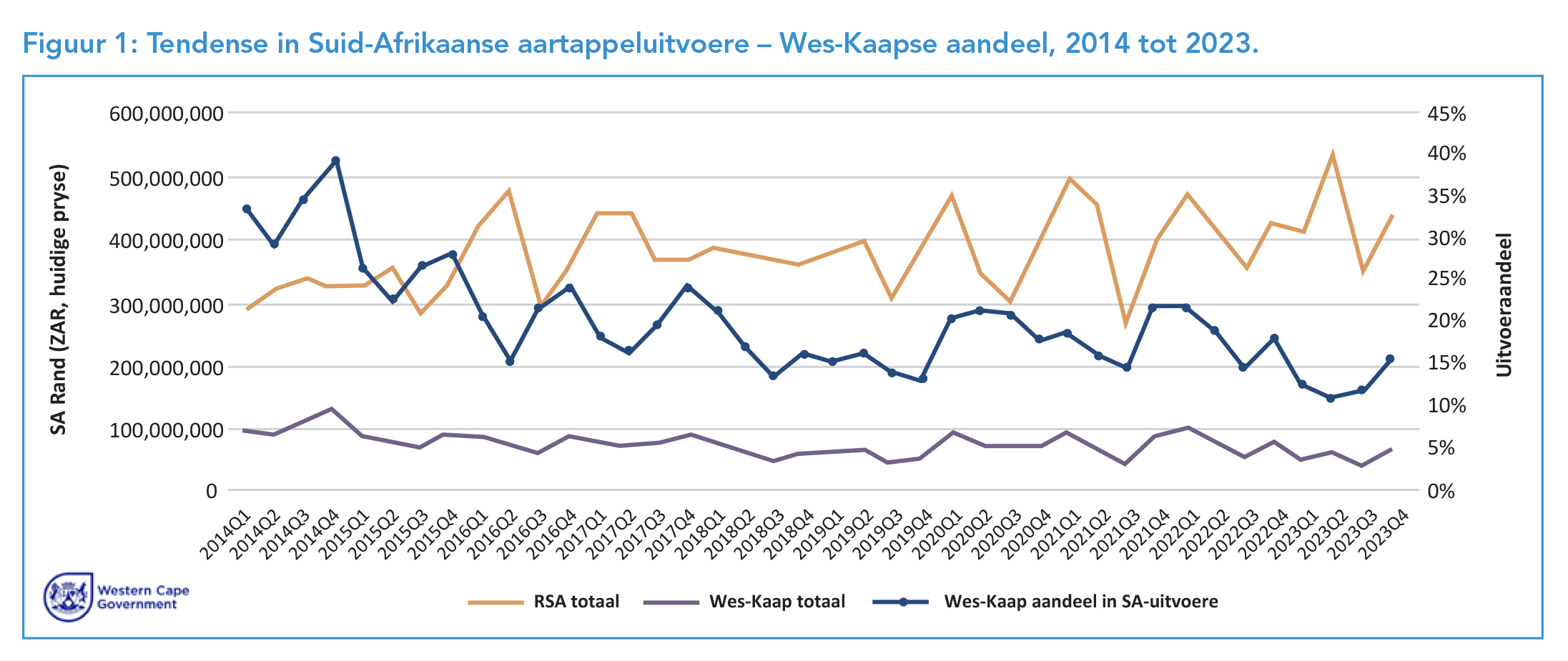 Dr Ivan Meyer, die Wes-Kaapse minister van landbou, het daarop gewys dat Suid-Afrika se aartappeluitvoere met 34% gegroei het van R324 miljoen in 2014 na R434 miljoen in 2023. Oor dieselfde tydperk het die Wes-Kaap se aartappeluitvoere met 46% gedaal, van R126 miljoen na R67 miljoen. Die Wes-Kaap se aandeel in totale aartappeluitvoere het van 39% in 2014 na 16% in 2023 gedaal (Figuur 1).