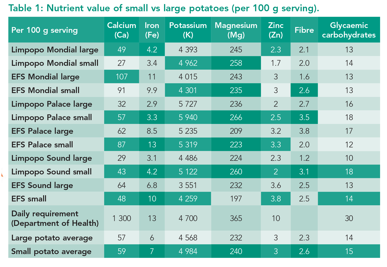 - Zinc (Zn), which is important for immunity and children’s growth, was present in high levels (3.8 mg/kg) in the small Sound and Palace varieties harvested in the Eastern Free State. All the averages indicated that small potatoes generally deliver more nutrients per 100 g than large potatoes. We attribute this outcome to a lower water-to-nutrient ratio than larger potatoes.
