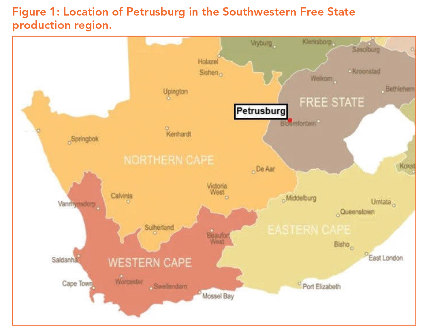 Petrusburg is located in South Africa’s dry continental region (Figure 1). The farm where the trial was conducted has experienced an average annual rainfall of 565 mm over the past 25 years, as recorded by the local Agricultural Research Council (ARC) weather station. This region is characterised by very hot summers and cold winters, with frost occurring from June to August.