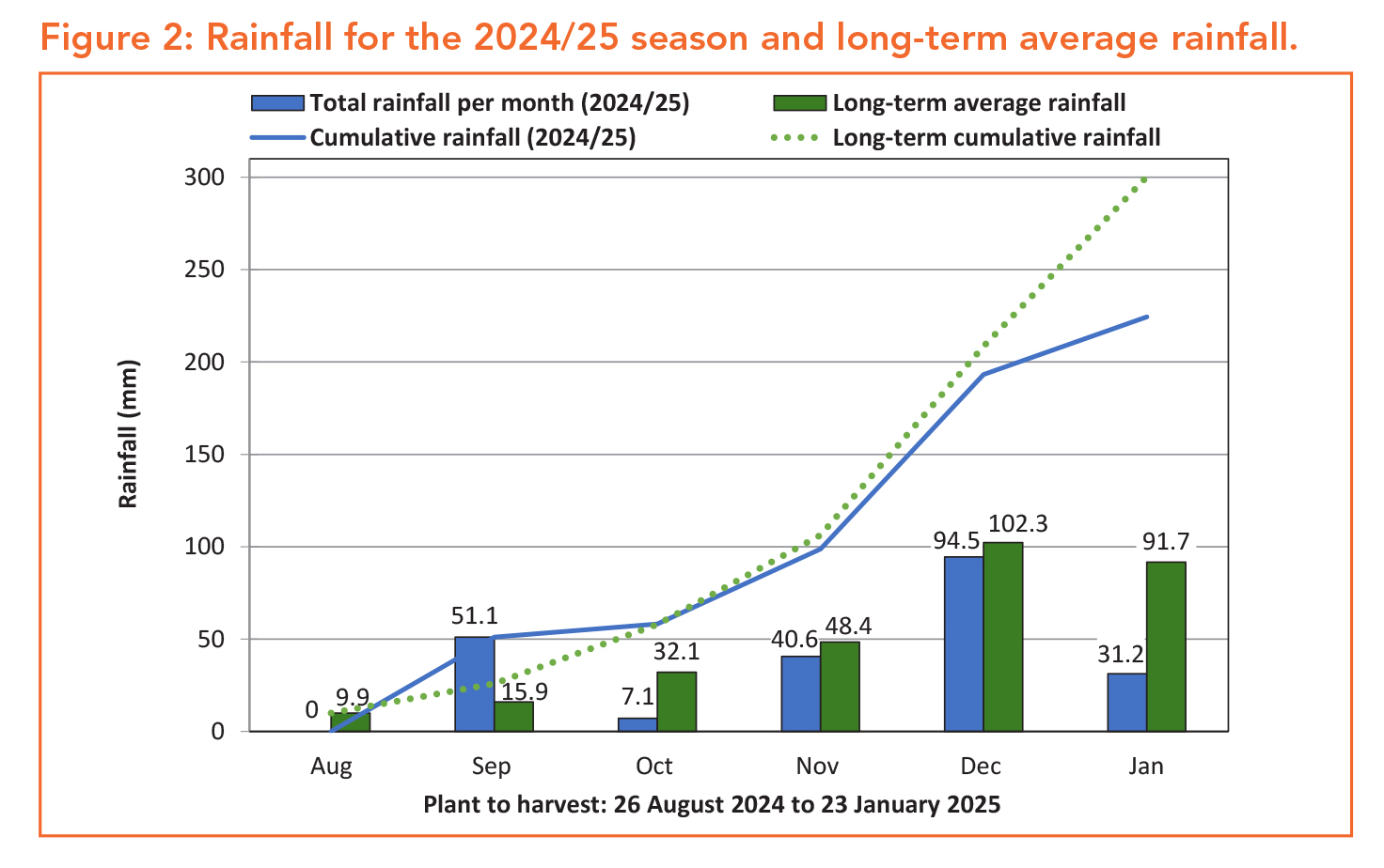 The rainfall trend for the 2024/25 season (Figure 2) shows considerably less cumulative rainfall than the long-term average. Post-harvest quality evaluations indicate that a persistently waterlogged soil profile was responsible for seasonal challenges. Considering the daily rainfall data, it is clear that fairly frequent and continuous showers had a major impact on quality and specific disease pressures.