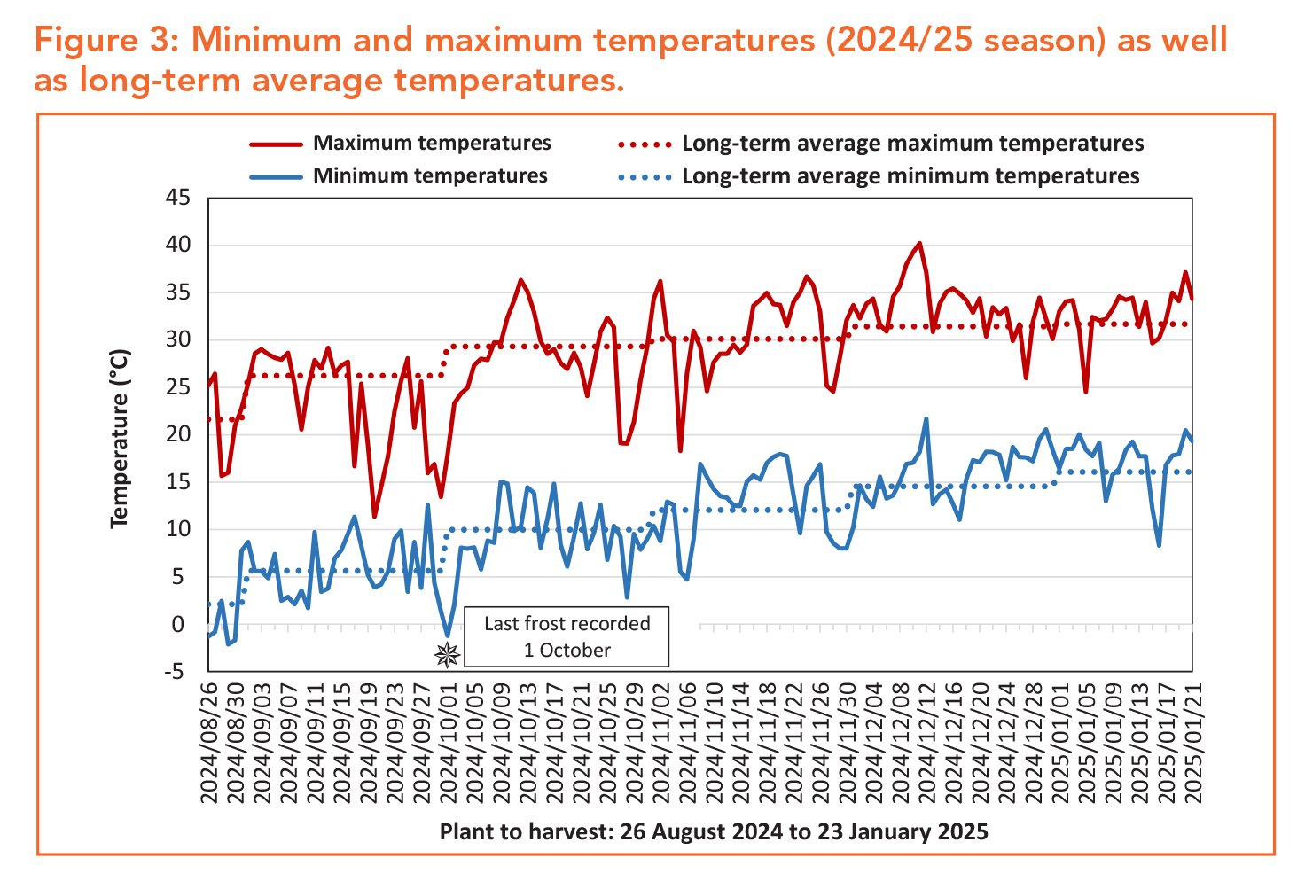 Minimum and maximum temperatures are illustrated in Figure 3. The last (and only) frost was recorded on 1 October, roughly a month after planting. At the end of November, as well as throughout almost all of December and January up to harvest, numerous consecutive days with maximum temperatures above 30°C, and some even reaching up to 40°C, were recorded.