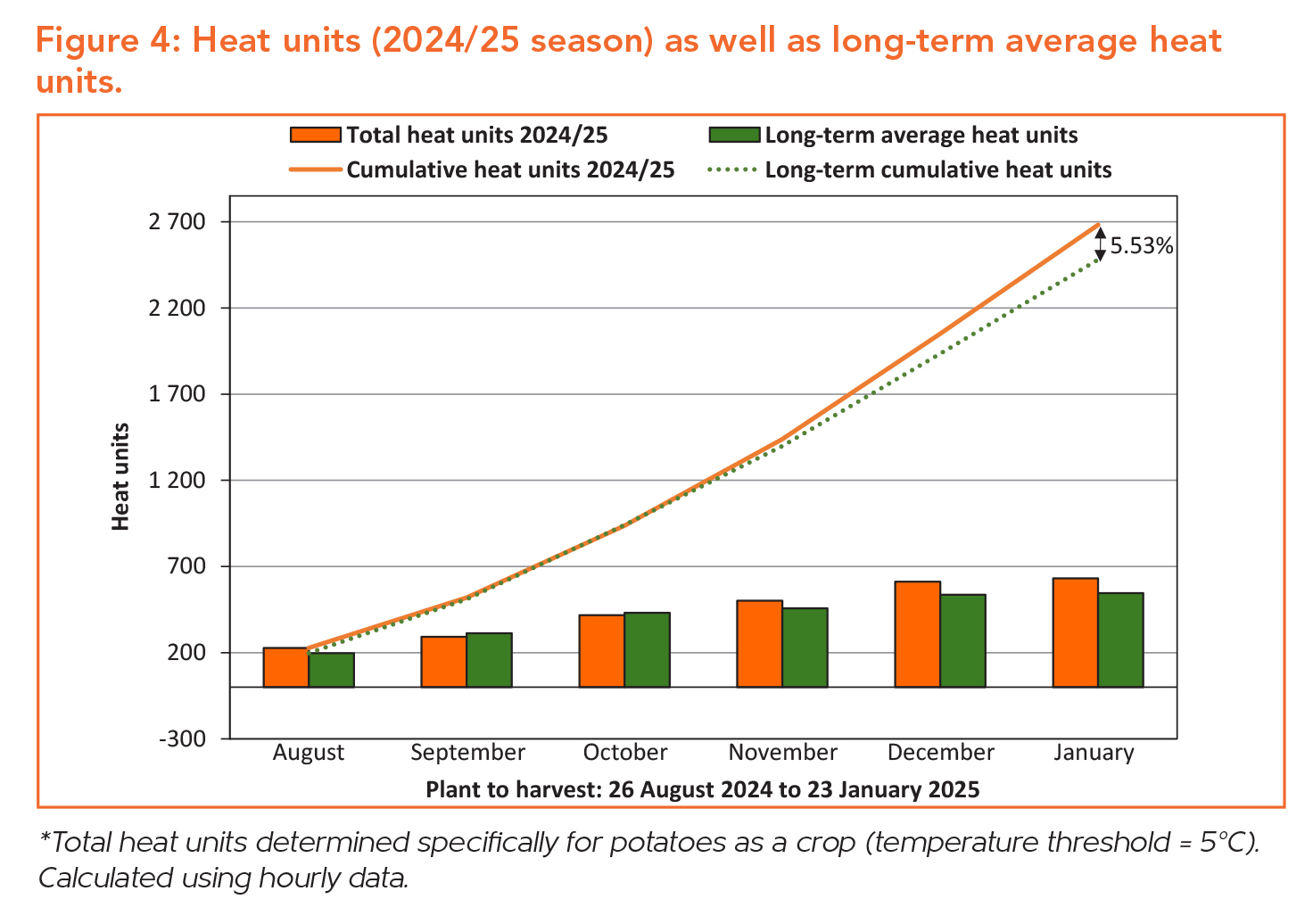 The collection of heat units during a growing period is an important factor in the development of a potato plant. The trend of heat units available for this cultivar trial appears to be higher than the long-term data trend of heat units (Figure 4). This can be attributed to the number of above-average hot days, particularly in December and January, which resulted in greater accumulation of heat units.