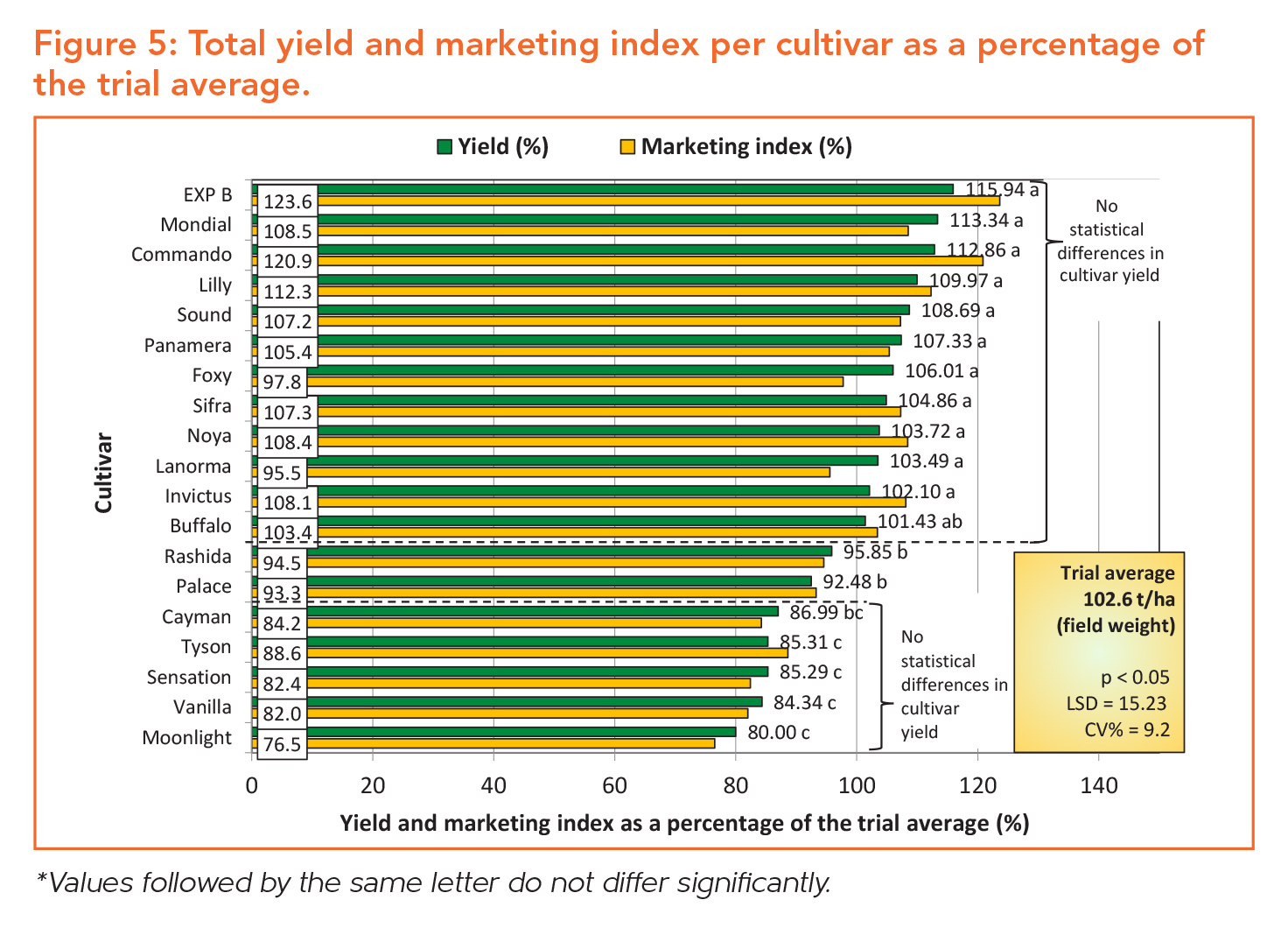 The Tukey test of least significant differences (LSD) was used to separate the mean. The cultivar effect during this trial (Figure 5) was statistically significant (p<0.05) and the coefficient of variation (CV) was low (9.2%). These factors indicate that the trial was well executed, and the results are therefore reliable.
