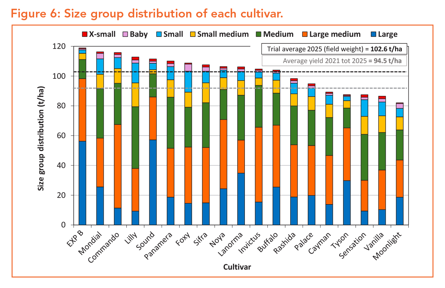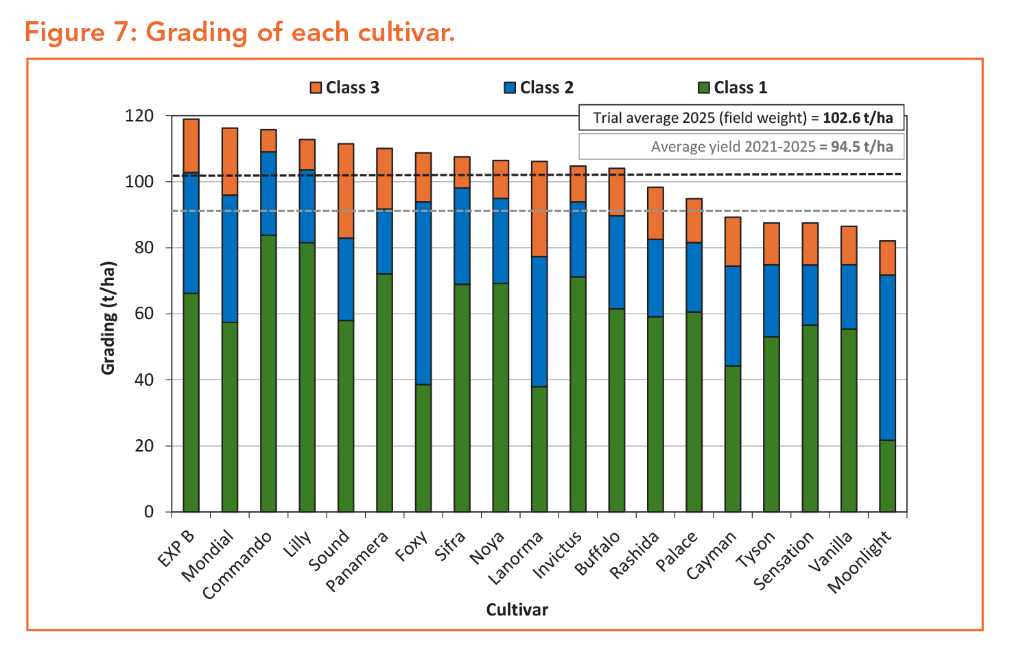 The evaluation of new cultivars, as in the case of the Petrusburg cultivar trial, provides results relating to yield and marketing index. The marketing index of the cultivars involved are calculated by classing and sorting each cultivar based on quality and size groups (for example Class 1 large or Class 2 large-medium). In this trial, all three replications were combined, washed, graded, and sorted by the storage facility.