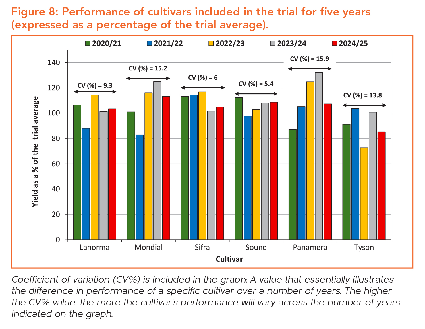 Given the nature of the seasons, cultivar performance will vary from one season to the next, simply because climate varies from one season to the next. Thus, it is important to consider consistent cultivar performance across a number of seasons, rather than relying on the good performance of a single season. Sound and Sifra showed the least variation in the Petrusburg cultivar trials from 2021 to 2025 (Figure 8).