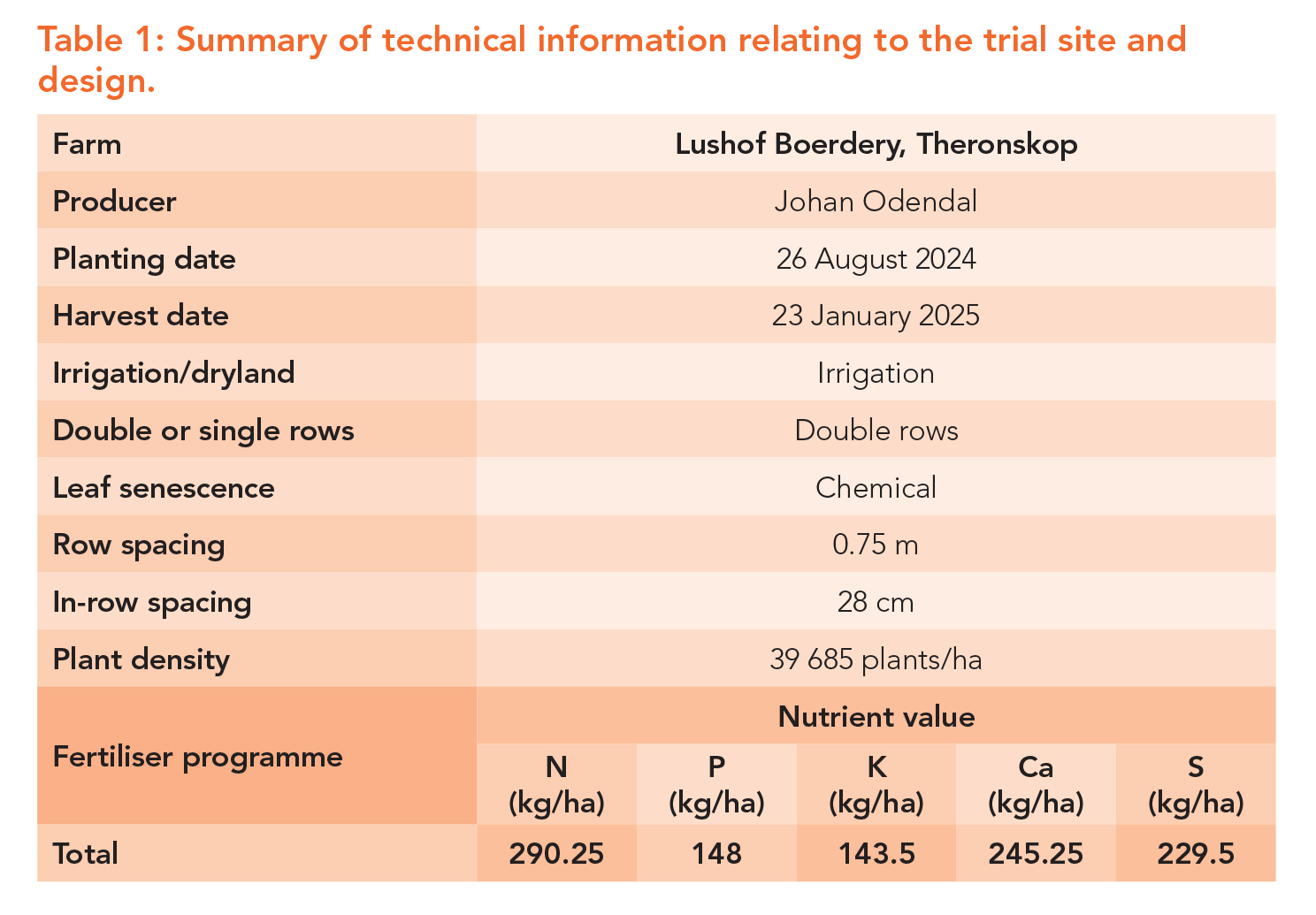 The average yield of the trial in the 2024/25 season was 102.6 t/ha, which is higher than the trial average of 94.5 t/ha from the previous five cultivar trials at Petrusburg (2021 to 2025). Good water quality can be regarded as a factor contributing to high yield.