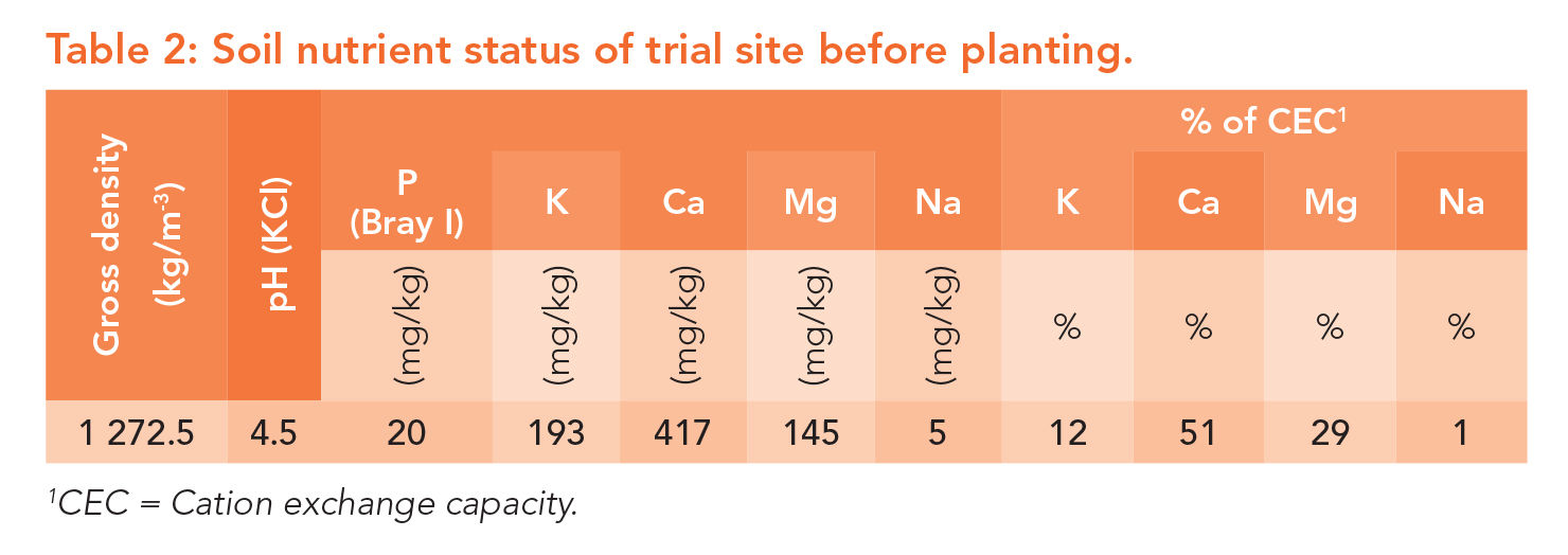 The cultivar trial at Petrusburg is laid out in a random block design with three replications per cultivar. Table 1 contains extra information relating to the trial. Soil samples were taken prior to planting in order to determine the soil nutritional profile of the trial site (Table 2).