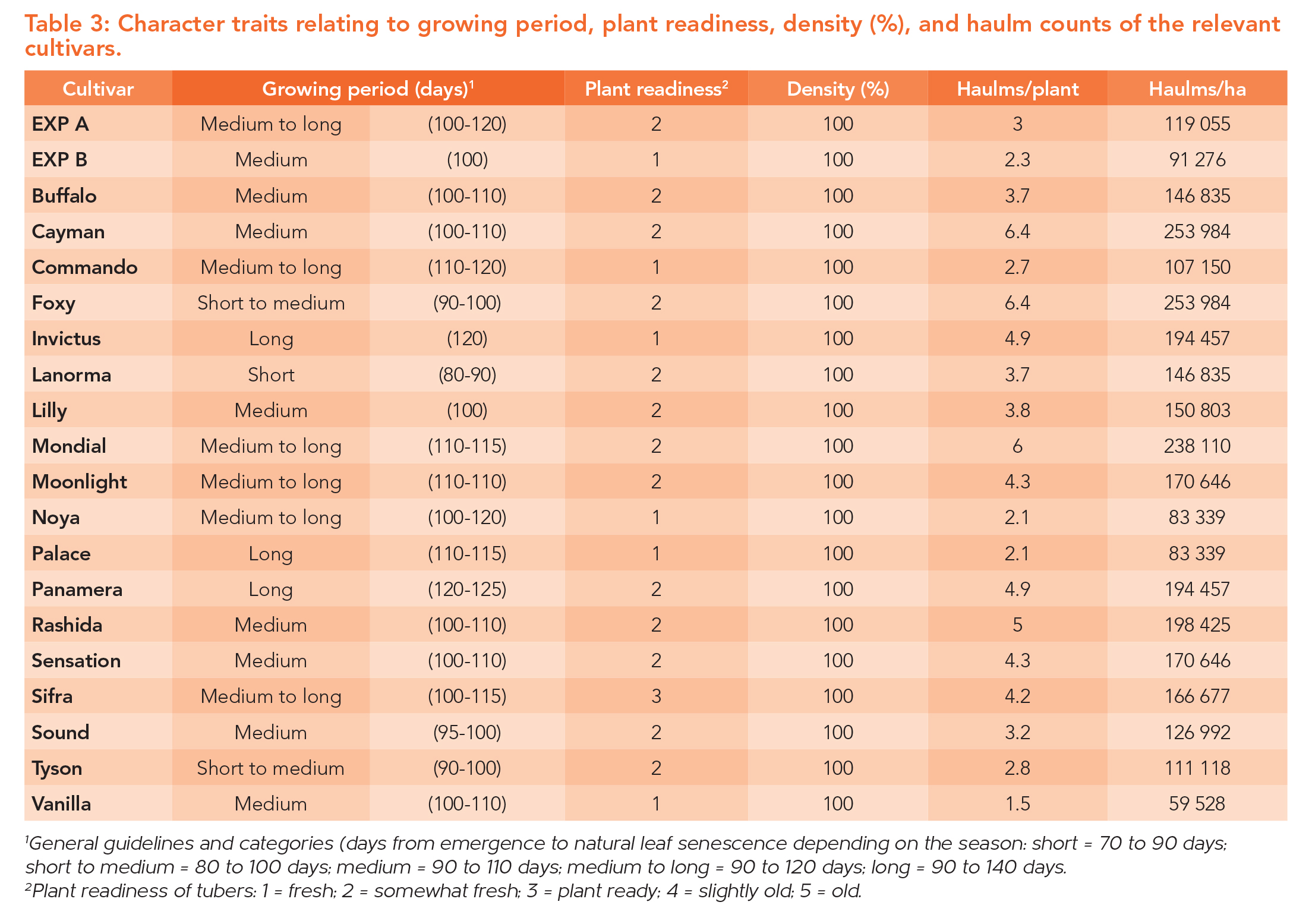 Table 3 sets out how these growing periods differ among cultivars. The plant readiness of tubers at the time of planting, as well as the haulm count observed later in the growing season, are also presented in Table 3.