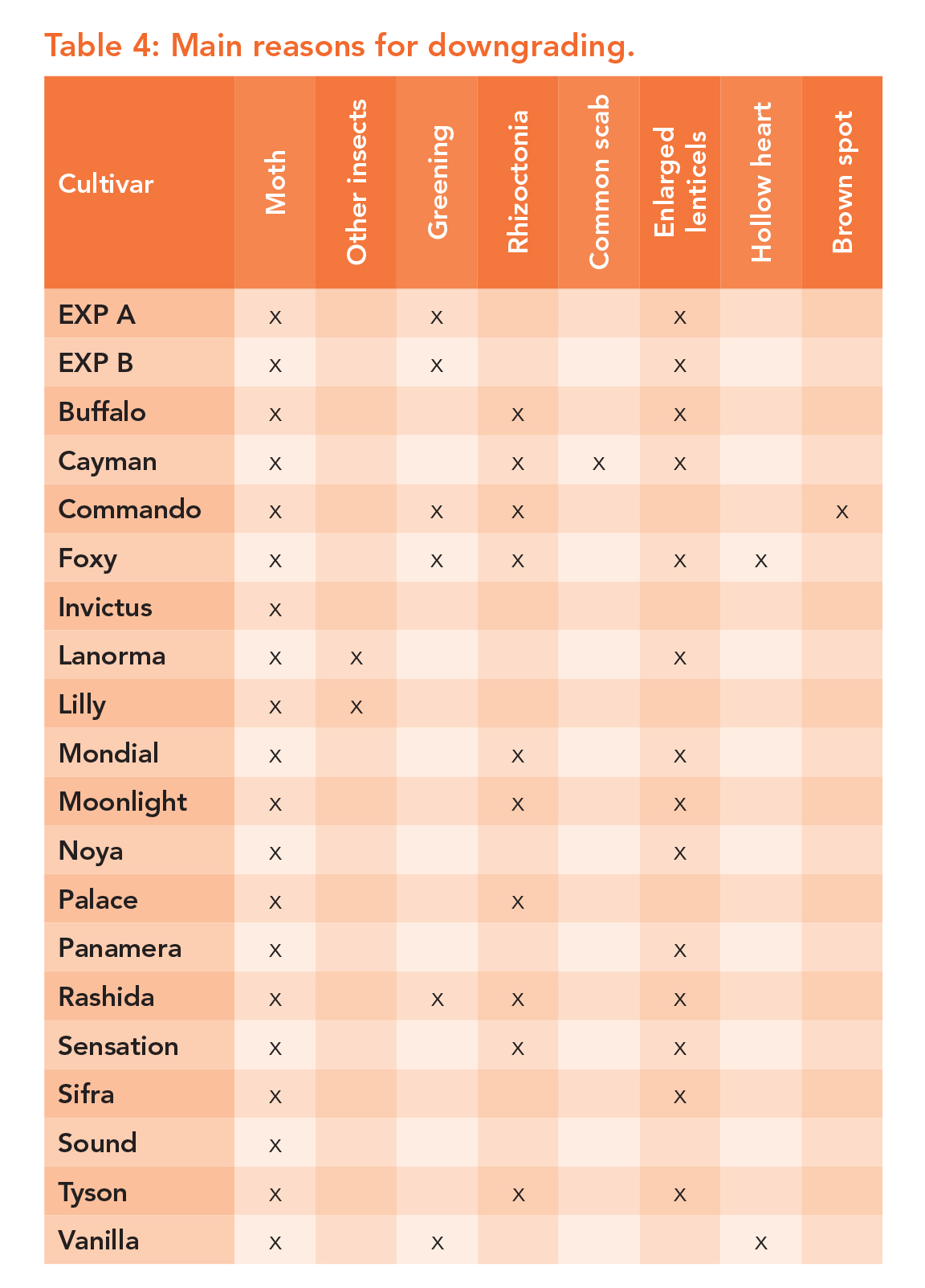 Moths, rhizoctonia, and enlarged lenticels were the main causes of downgrading. Rhizoctonia often appears as a result of cool, wet conditions and high soil moisture levels. The enlarged lenticels also indicate that the soil may have been too wet for extended periods due to weather conditions such as continuous light showers that kept the soil saturated. Brown spot and hollow heart were observed in a few cultivars.