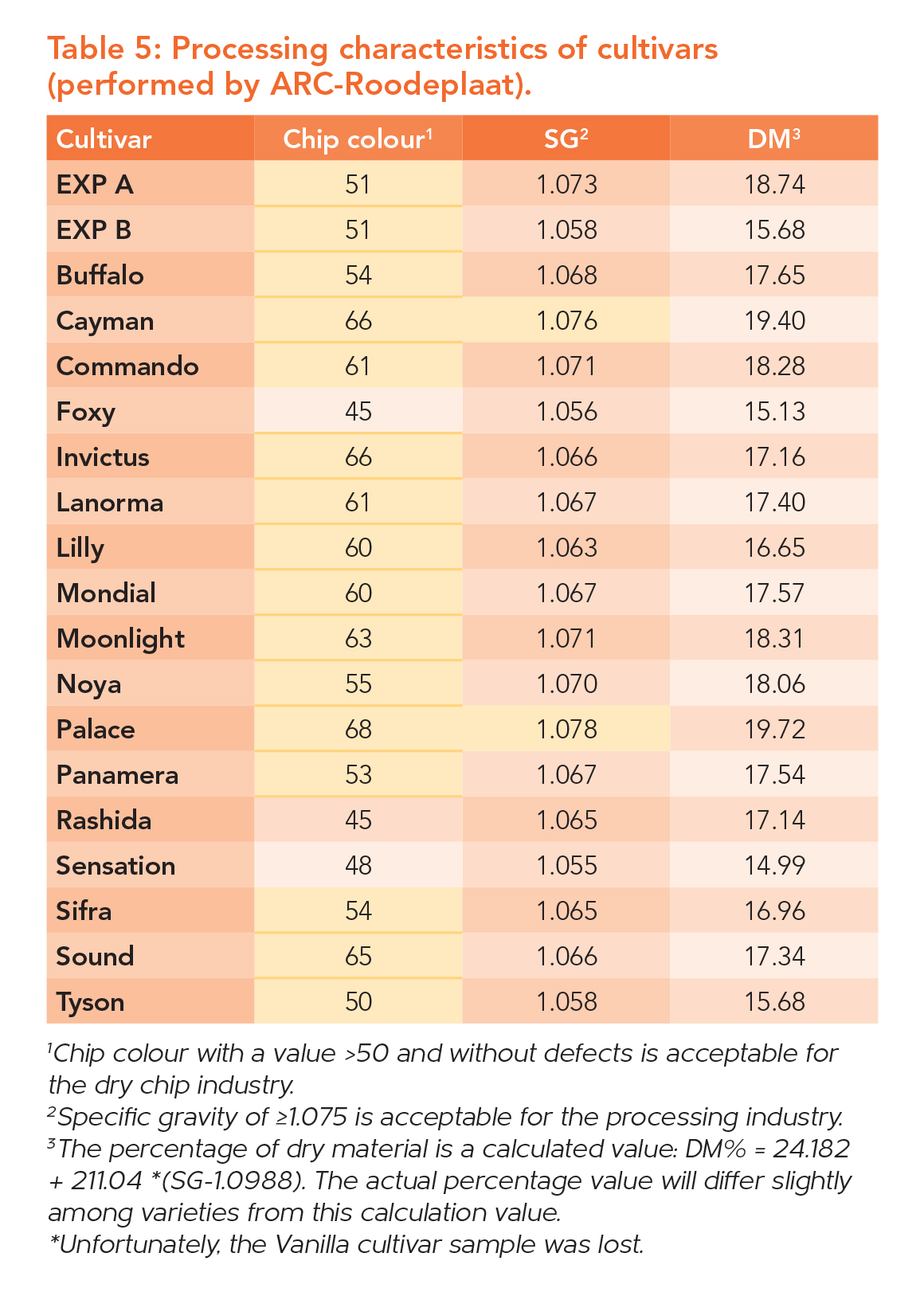 Lastly, when considering the internal quality of potatoes, processing characteristics can also be evaluated. To adhere to processing requirements, cultivars must meet a chip colour standard of >50 and a specific gravity (SG) of ≥1.075 (Table 5). Cayman and Palace met both the chip colour and SG requirements, while many of the cultivars only met the correct chip colour requirement. – Enrike Verster, Potatoes SA, and Johan Odendal, producer