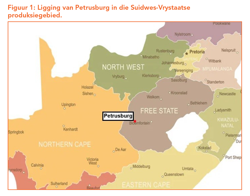 Petrusburg val in Suid-Afrika se droë kontinentale gebied (Figuur 1). Die plaas waarop die proef uitgevoer is, ontvang die afgelope 25 jaar ’n gemiddelde jaarlikse reënval van 565 mm, soos deur die plaaslike Landbounavorsingsraad- of LNR-weerstasie aangeteken. Dié streek word gekenmerk aan baie warm somers en koue winters, met ryp wat vanaf Junie tot Augustus kan voorkom.