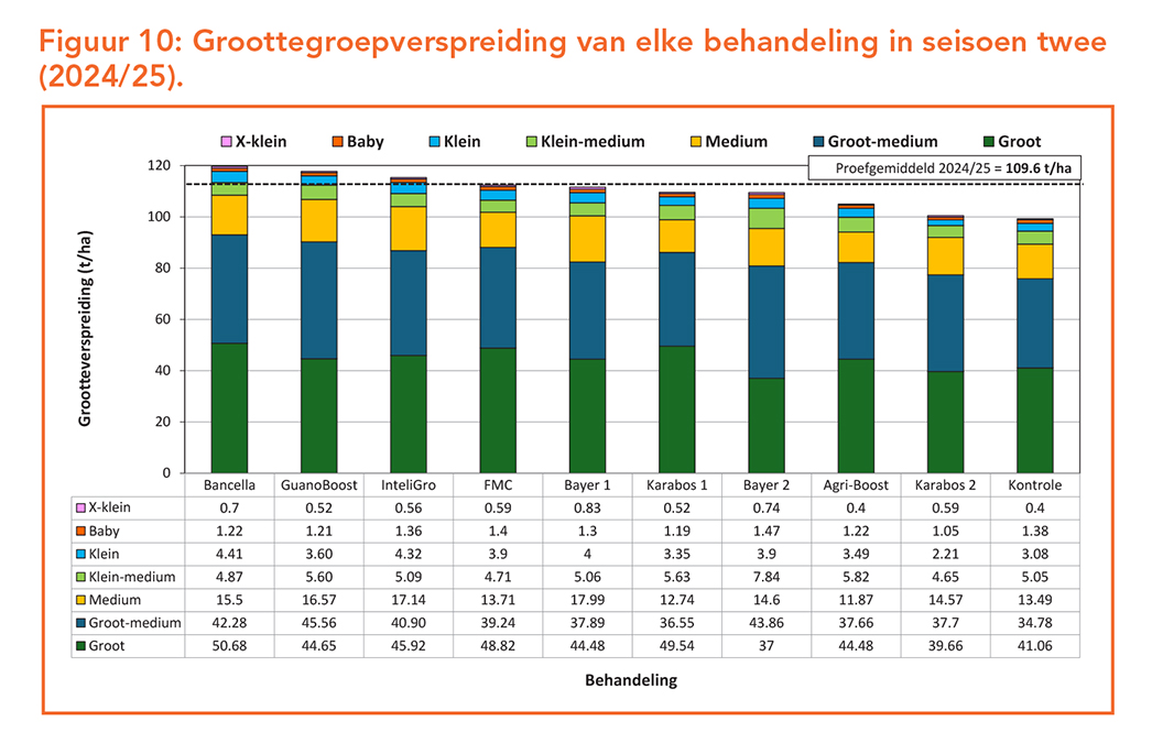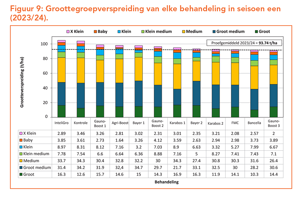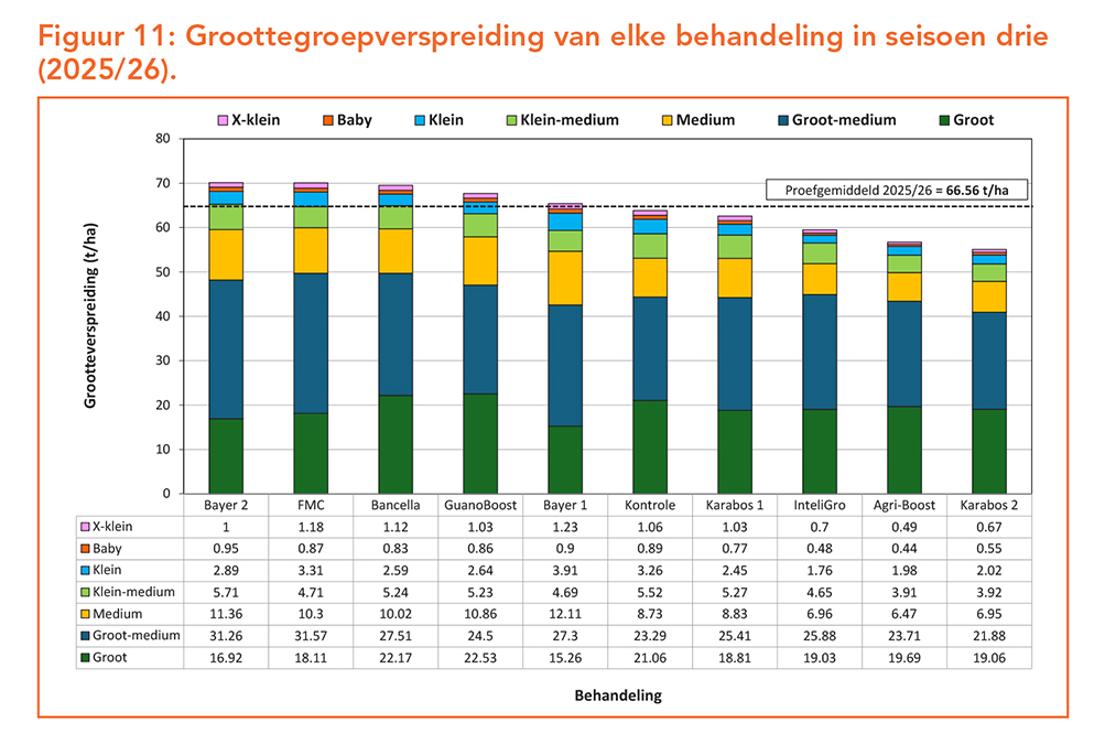 Groottegroepverspreiding van die behandelings word in Figuur 9 tot 11 vergelyk. Seisoen een en drie het aansienlik minder groot aartappels as seisoen twee geproduseer, wat oor die algemeen ’n baie hoë opbrengs gelewer het. Ten spyte van hierdie hoë opbrengs het seisoen twee egter in verhouding minder Klas 1-aartappels opgelewer.