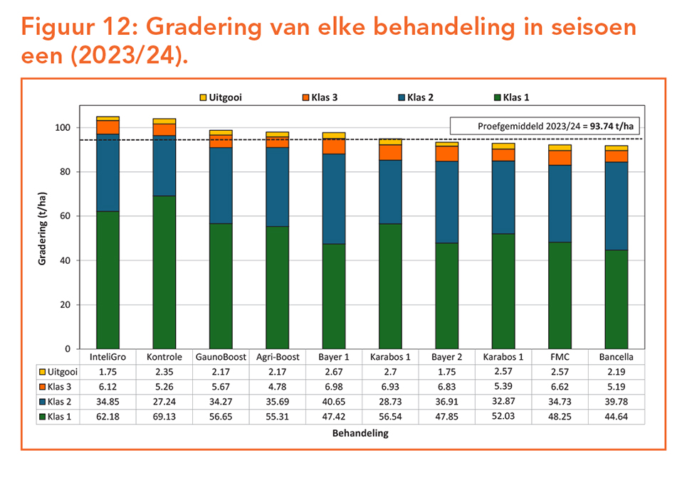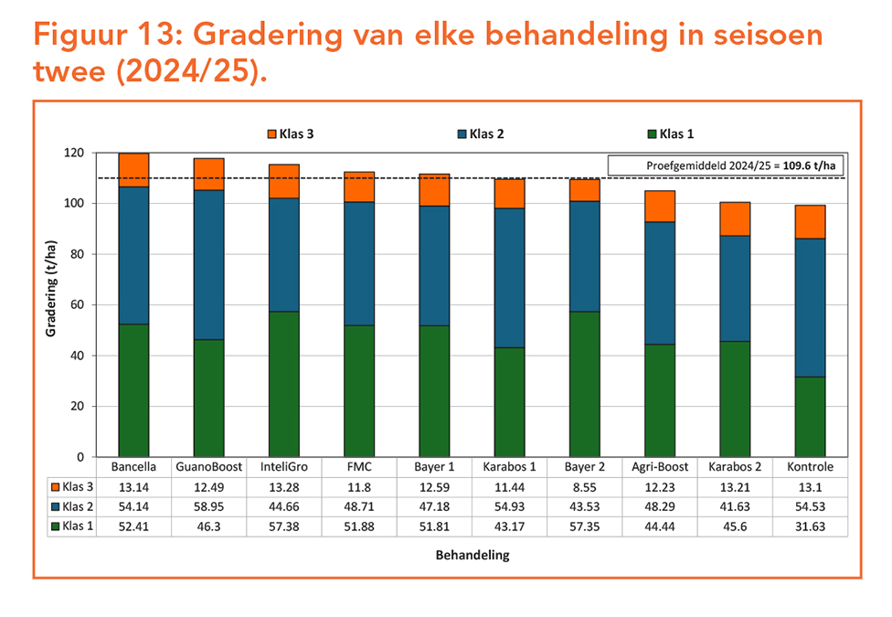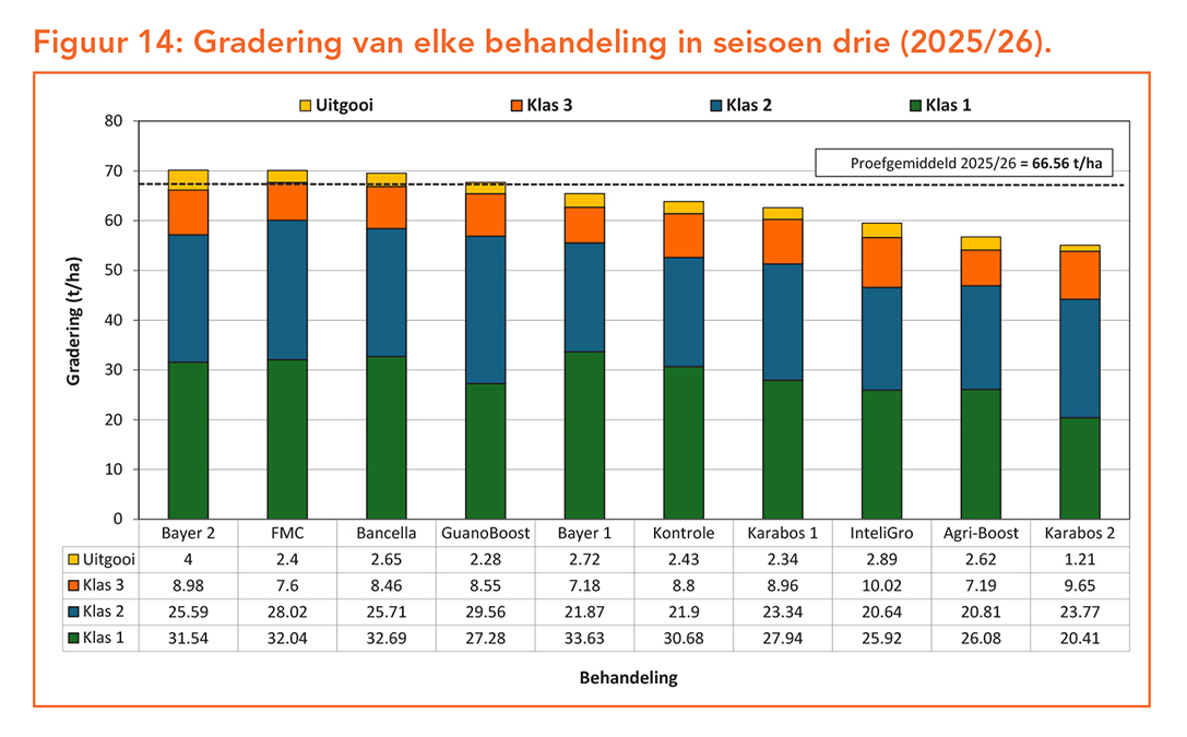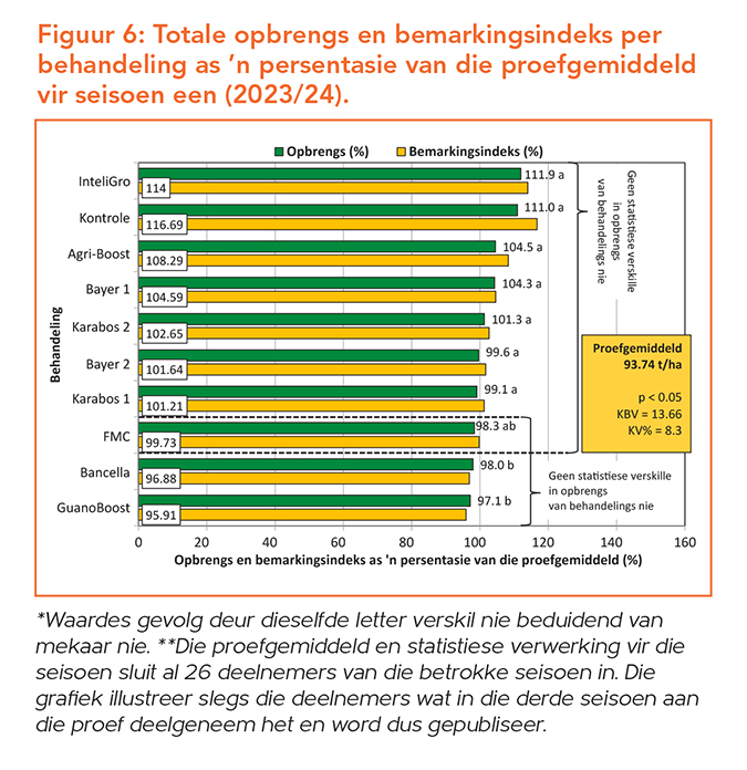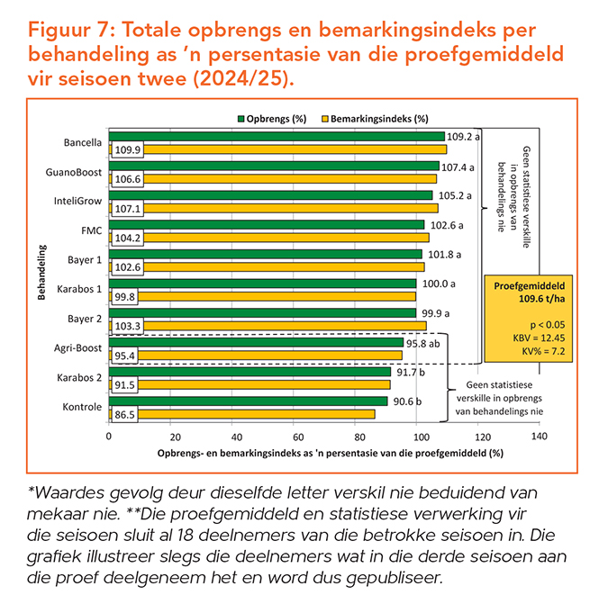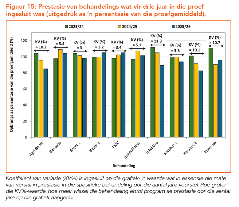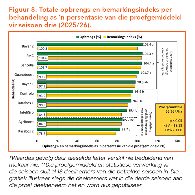 Min statisties-beduidende verskille is in seisoen een en twee waargeneem. In seisoen drie, met sy laer opbrengs, was daar egter duidelike verskille, met Bayer 1 en 2, FMC, GuanoBoost en Bancella wat die hoogste opbrengste gelewer het (Figuur 6 tot 8). Dit is belangrik om in ag te neem dat die behandelings nie noodwendig met mekaar vergelyk kan word nie, aangesien die programme verskillende en uiteenlopende uitkomste het.