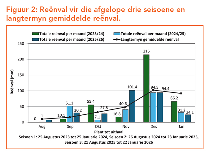 Die reënvaltendens vir die afgelope drie seisoene word in Figuur 2 uiteengesit. Hoë reënval is in die eerste maande na plant in seisoen een en twee aangeteken. Seisoen twee en drie het tydens knolvulling in die laaste helfte van die seisoen uitermatige bogemiddelde reënval ervaar, wat moontlik gehalteprobleme en meer Klas 3- en weggooi-aartappels tot gevolg gehad het.