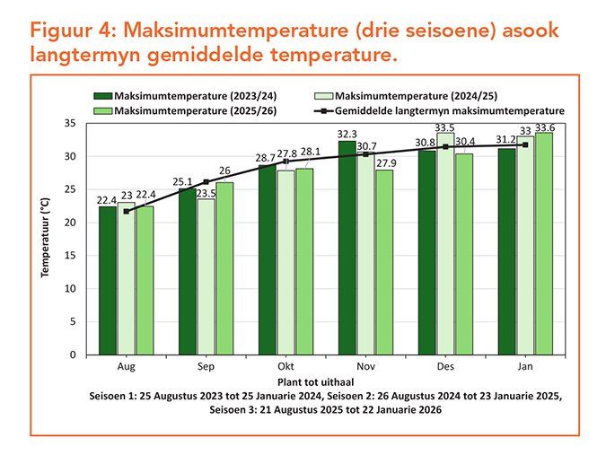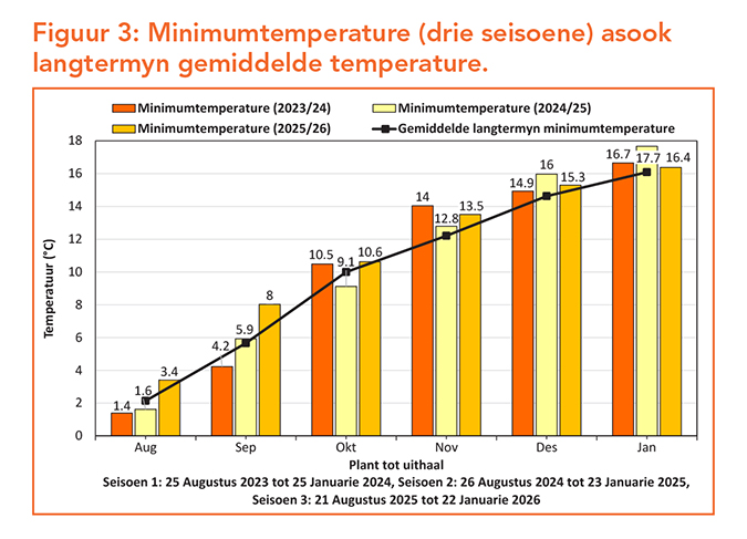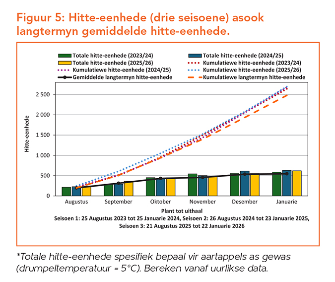 Die minimum- en maksimumtemperature word in Figuur 3 en 4 uiteengesit. Die versameling van hitte-eenhede tydens ’n groeitydperk is ’n belangrike faktor in die ontwikkeling van ’n aartappelplant. Die tendens van hitte-eenhede wat vir die afgelope drie seisoene beskikbaar is, toon dat dit veral gedurende seisoen drie hoër was as die langtermyn gemiddelde van hitte-eenhede wat in die eerste helfte van die groeiseisoen geakkumuleer is.