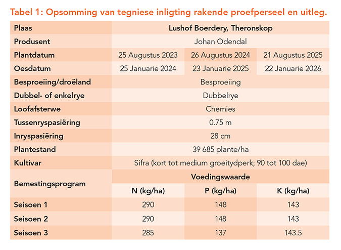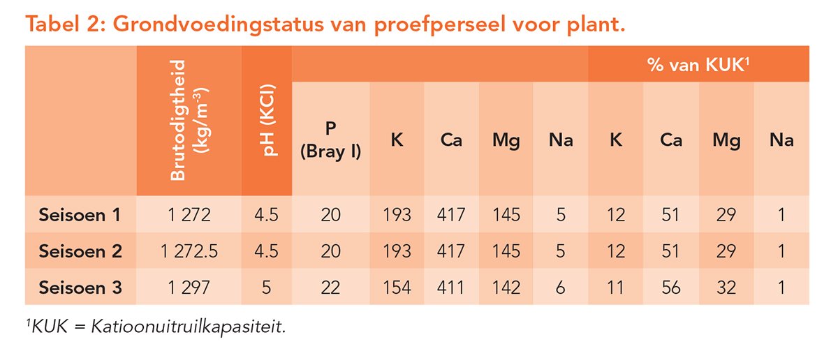 Die produkteproef by Petrusburg is in ’n ewekansige blokontwerp met drie herhalings per kultivar uitgelê. Tabel 1 bevat relevante tegniese inligting rakende die proef. Grondmonsters is voor plant geneem om die grondvoedingstatus van die proefperseel te bepaal (Tabel 2).