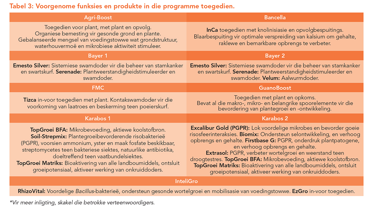 Die standaard spuit- en bemestingsprogramme van die plaas dien as die kontrolebehandeling in hierdie proef. Hierdie artikel sluit die kontrolebehandeling sowel as die programme soos in Tabel 3 uiteengesit, in.