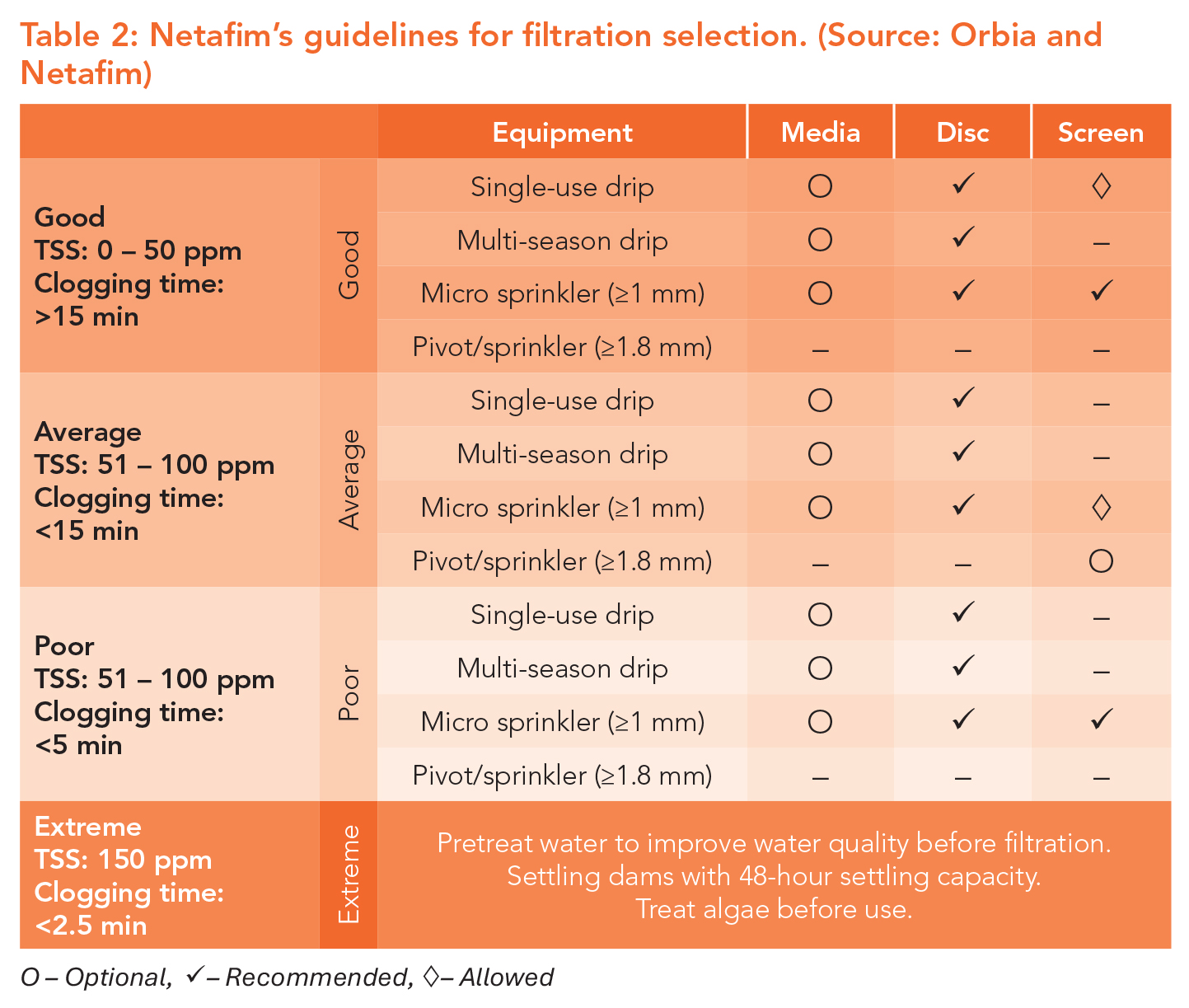 The irrigation industry sets important standards for water analysis and irrigation water suitability in its Irrigation Design Manual, published by the Agricultural Research Council and The Water Research Commission in cooperation with other industry bodies. Neethling says it is important that filtration standards are strictly adhered to when selecting an irrigation filtration system. Filtration requirements must be communicated by the manufacturer of the irrigation system, and specifically those pertaining to the emitter. “It is crucial that these filter requirements are adhered to as it will ensure the longevity and optimal operation of the system. In addition, do not neglect the filtration guidelines communicated by the manufacturer of irrigation filters. Do not cut corners when planning the filtration section of an irrigation system. The success of filtration will determine the efficiency and sustainability of the entire system. Do not allow filters to cause a weak link in a well-designed system.”