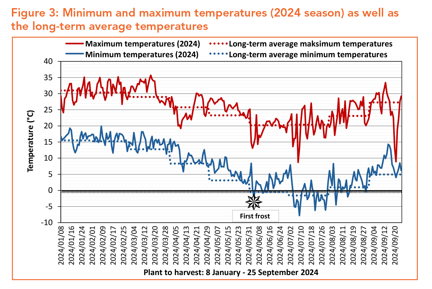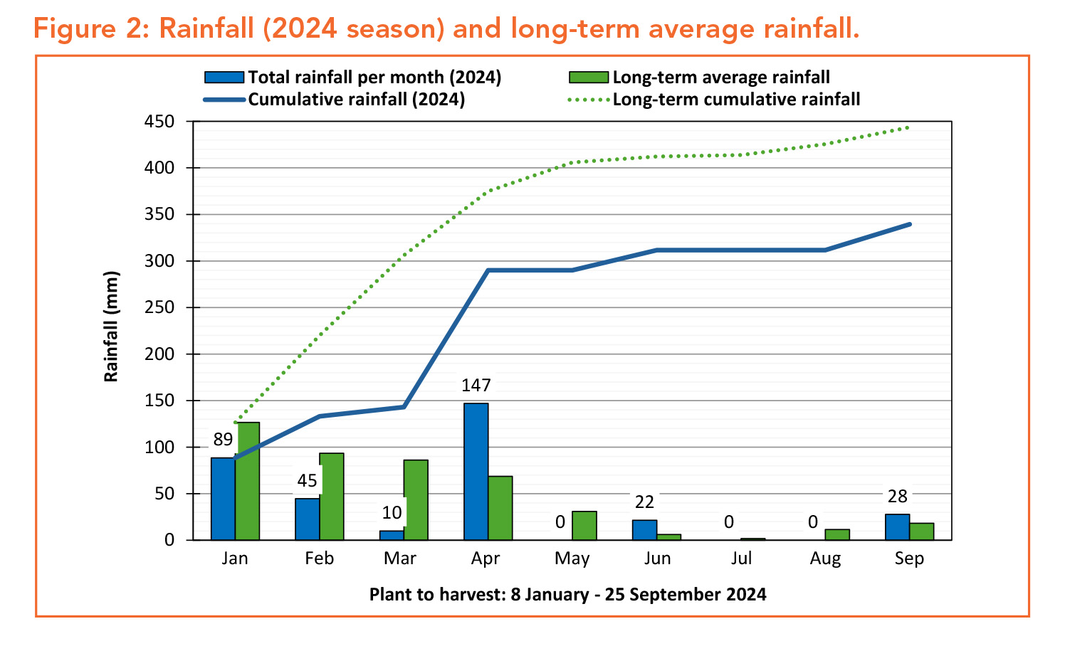 The rainfall trend for the 2024 season indicates a rainfall figure that is substantially lower than the normal long-term average. In a dryland trial such as this, the low rainfall that continued throughout most of the growing season was catastrophic in terms of yield. All rainfall up until the end of March was very low and isolated, thus limiting the difference rain could have made. Exceptionally high rainfall was recorded towards the end of the growing season, but the 147 mm recorded in April fell over just a few days at the beginning of the month (Figure 2).