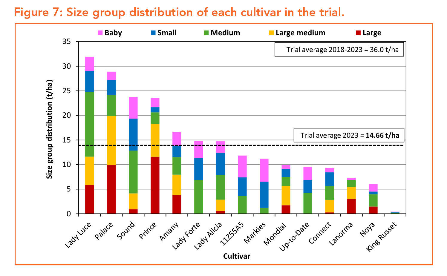 The evaluation of new cultivars such as in the Kroonstad cultivar trial delivers results regarding, among others, yield and marketing index. The marketing indices of the relevant cultivars are calculated by classing and sorting each cultivar according to quality and size groups (such as Class 1 large or Class 2 large-medium). Prices were then compared to market prices at harvest time.
