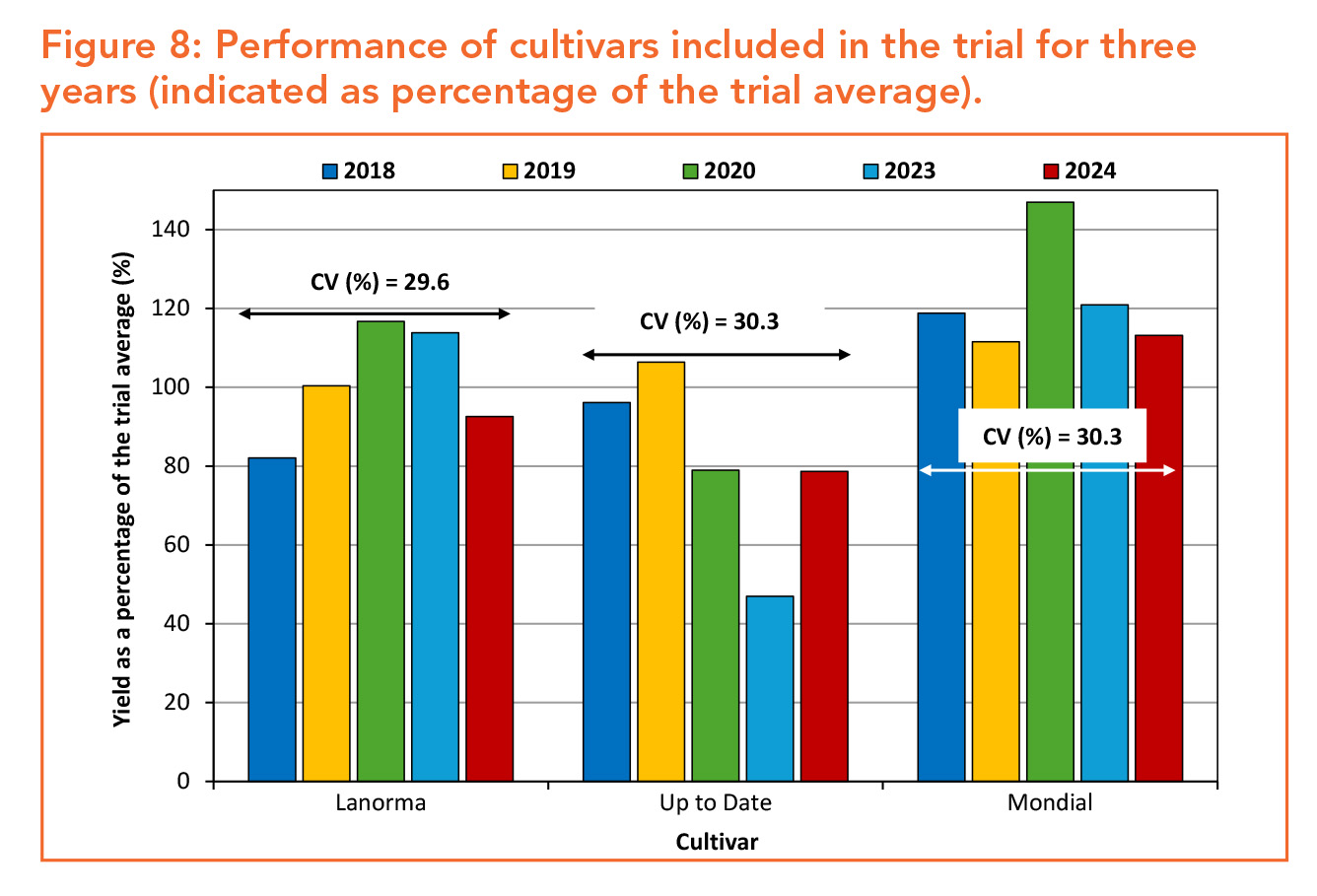 Just as seasons tend to fluctuate, so does the performance of cultivars from one season to the next. This is simply because the climate never the same from one season to the next. Therefore, it is important to consider consistent cultivar performance across a number of seasons. Mondial currently exhibits the least variation in the 2018 to 2024 Kroonstad cultivar trial (Figure 8).
