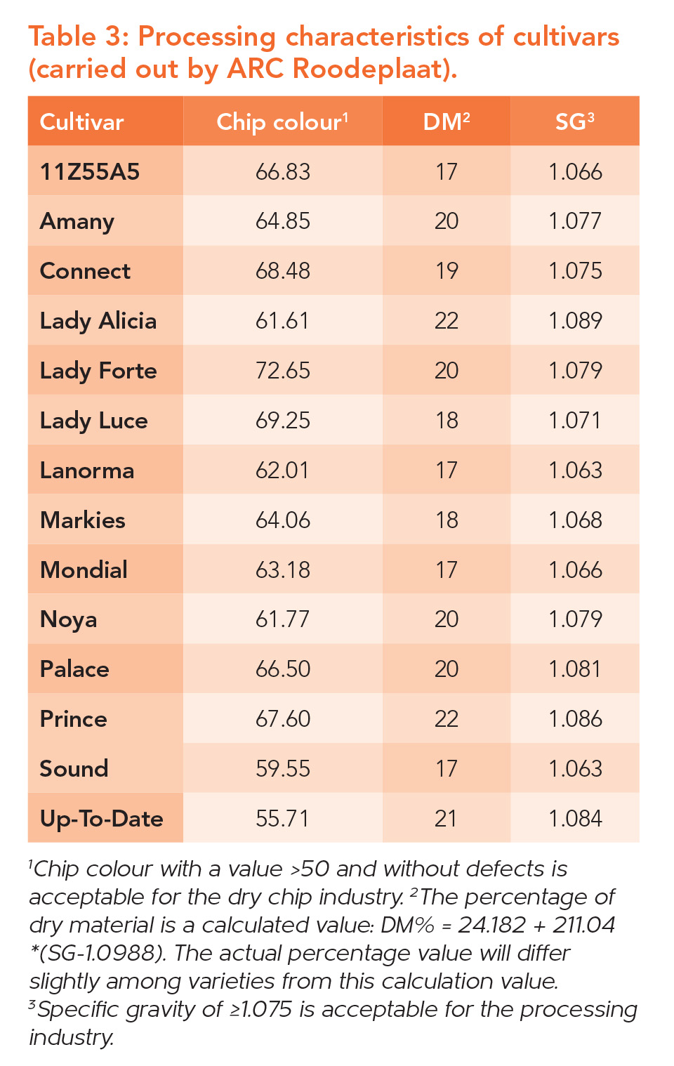 Finally, when observing the internal quality of potatoes it is also possible to evaluate processing characteristics. To comply with processing requirements, cultivars have to comply with a chip colour norm of >50 and a specific gravity (SG) of ≥1.075 (Table 3). Eight of the 14 cultivars met both the chip colour and SG requirements. – Enrike Verster, Potatoes SA