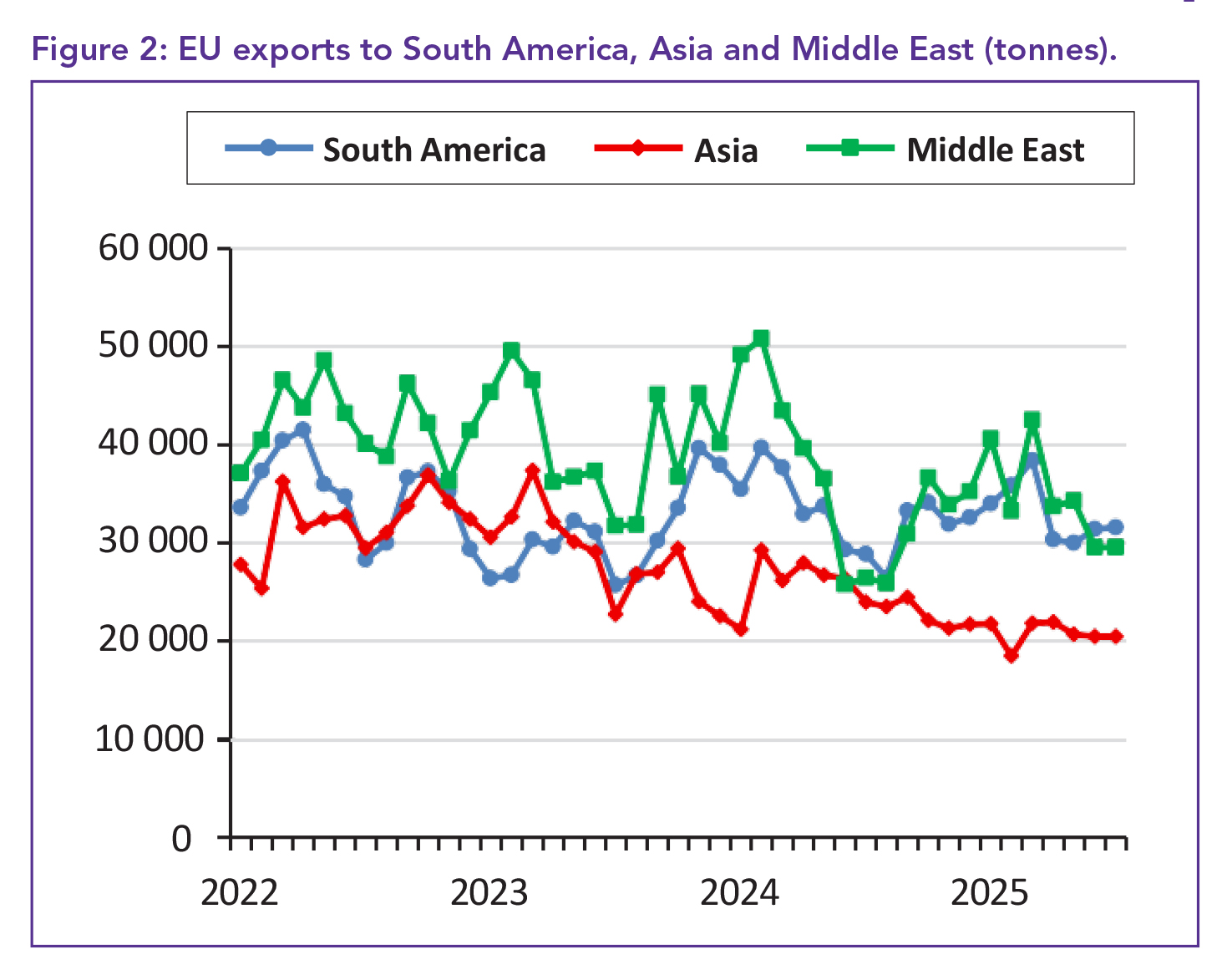 Asia showed mixed results. While overall regional sales declined by 13.4%, exports to Japan – Europe’s largest Asian buyer – reached 7 586 tonnes, the highest level since September 2024. Prices in Japan remained stable, and the average regional price dipped by just 1%.