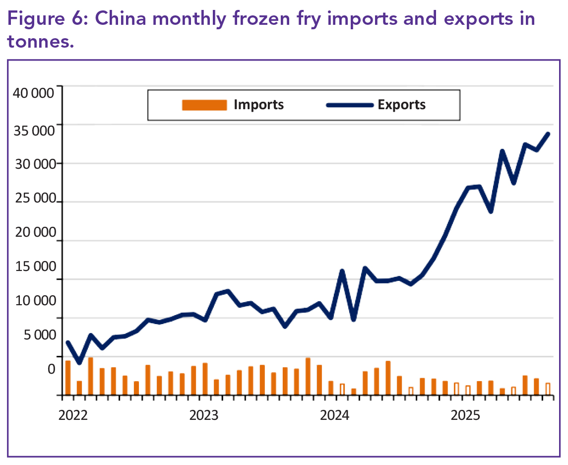Despite the rising export volumes, China’s average export price held steady at RMB 7 513/tonne (€899). Monthly fry export earnings nearly doubled to RMB 254 million (US$35.7 million) compared to August 2024.