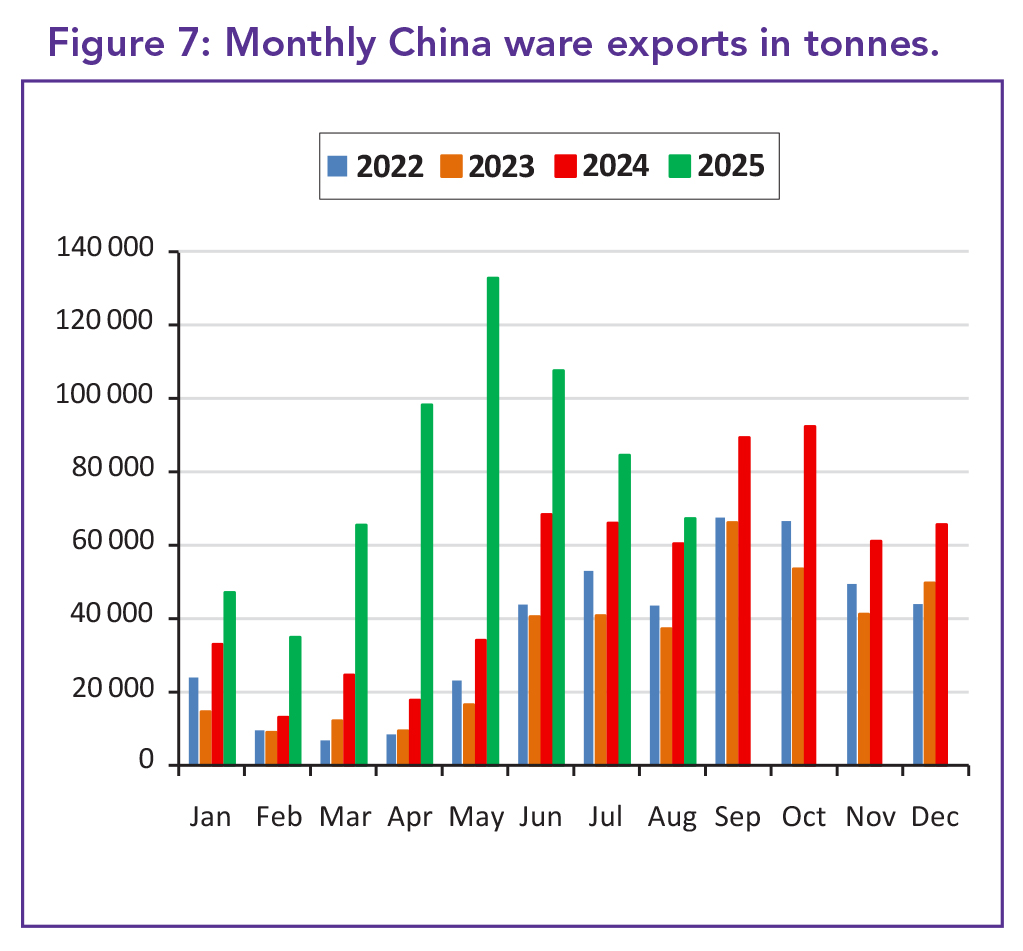 Meanwhile, China and India continued their remarkable export growth. China’s exports rose by 92.6% over the past year to 290 000 tonnes, representing a 2 475% increase since 2019. India also saw robust growth, with exports up 35.9% YOY and 653% over the past six years. Türkiye has also experienced strong export growth since 2019, although its momentum has recently slowed.