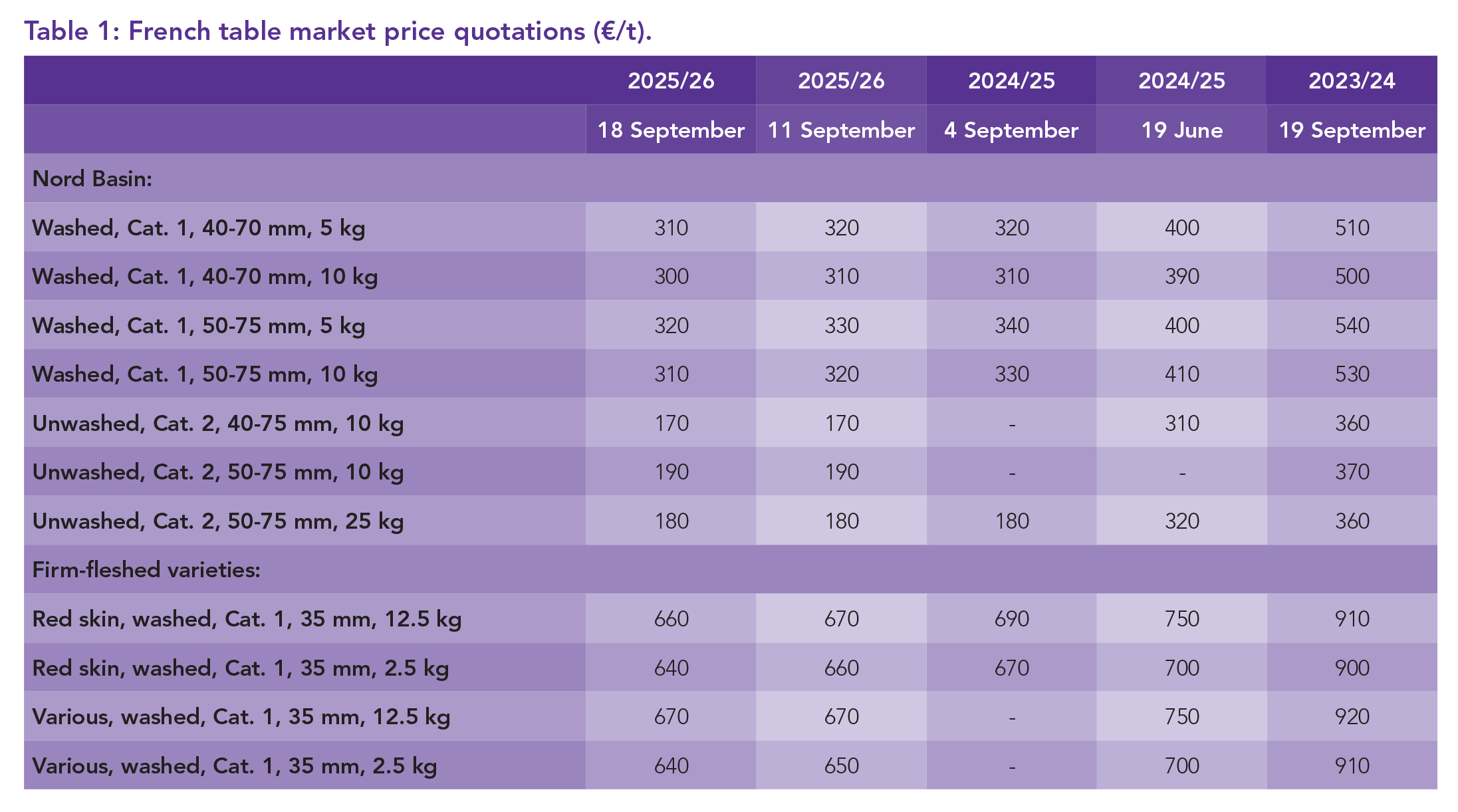 Table potato prices in France dropped in September as increased market supply continued to exert downward pressure. The benchmark Nord Basin price for Category 1 (10 kg pack) potatoes dropped €10 to €300/tonne, now €200 lower than at the same time last year. Prices haven’t been this low since the 2020/21 season, when they remained below €300 despite a surge in fresh potato consumption during the pandemic. Other varieties also recorded similar declines, with firm-fleshed potatoes now trading between €640 and €670/tonne, well below the €1 000-plus levels seen two years ago.