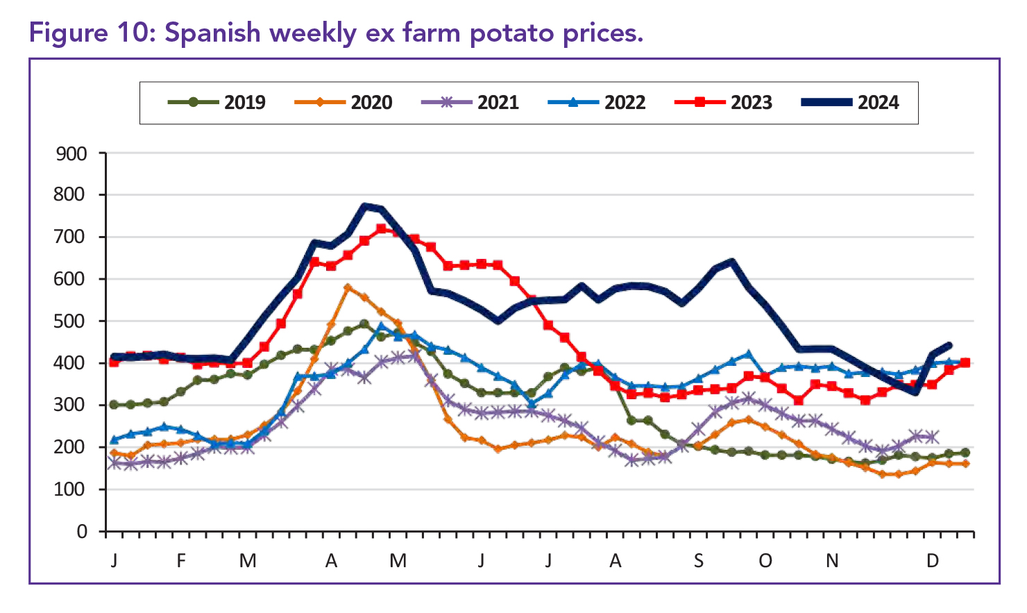 A larger area was planted in the South of Spain with potato planting in the Murcia and Andalucia regions of southern Spain progressing well. In Sevilla, 80% of the potato area was planted in January, with farmers rushing to finish before expected rain on 6 January this year. There is a larger early potato area this year compared to previous years after a decline in recent seasons.