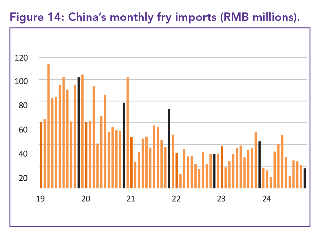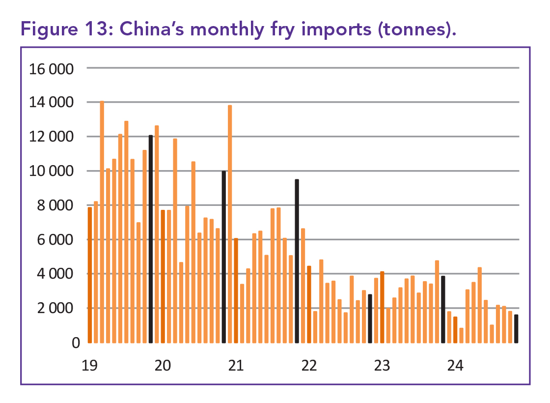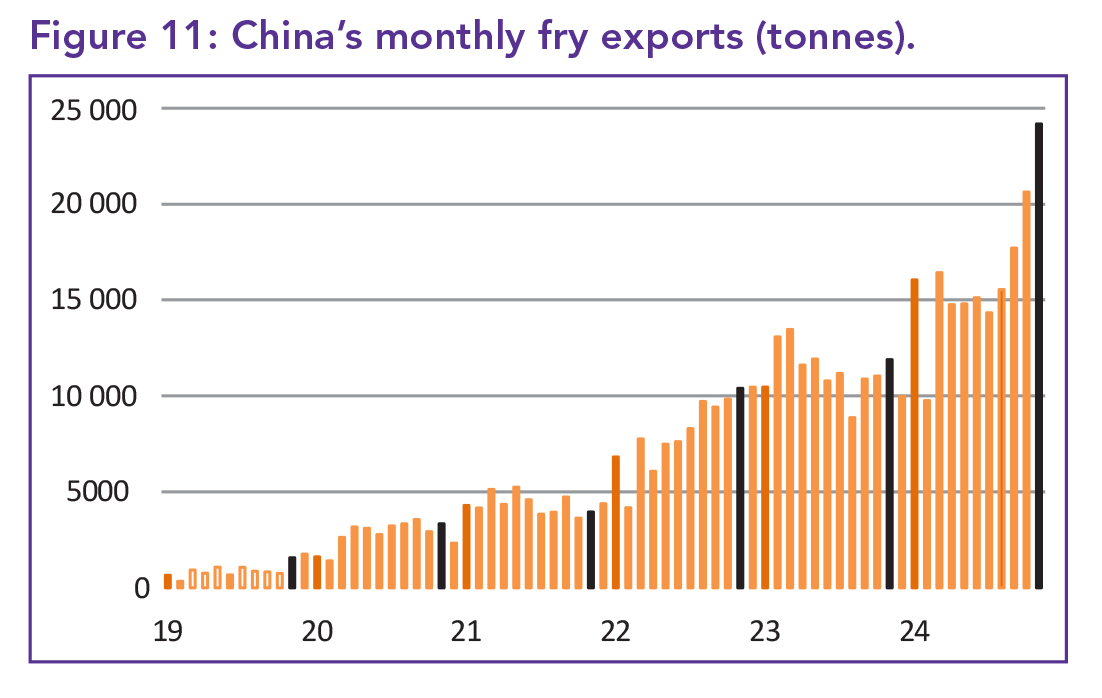 Turkey’s fry exports to China nearly doubled in November last year compared to October in the same year, driven by a RMB140 (R354) price reduction. Turkish fries were priced at RMB11 741/tonne (US$1 604 or R29 439/t; €1 558 or R29 958/t), while US fries were slightly more expensive at RMB12 106/t (US$1 654 or R30 356/t; €1 606 or R30 777/t), reflecting a RMB86 (R217) price increase from October last year and a 19.3% rise compared to 2023.