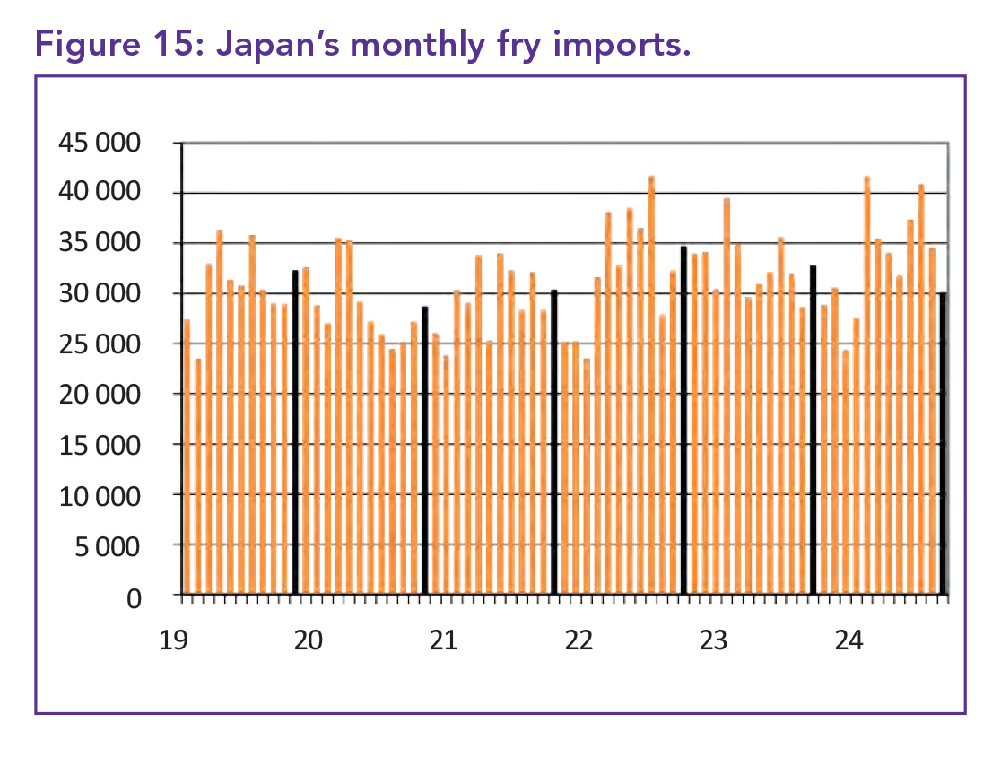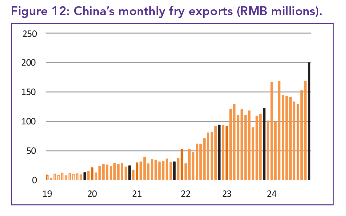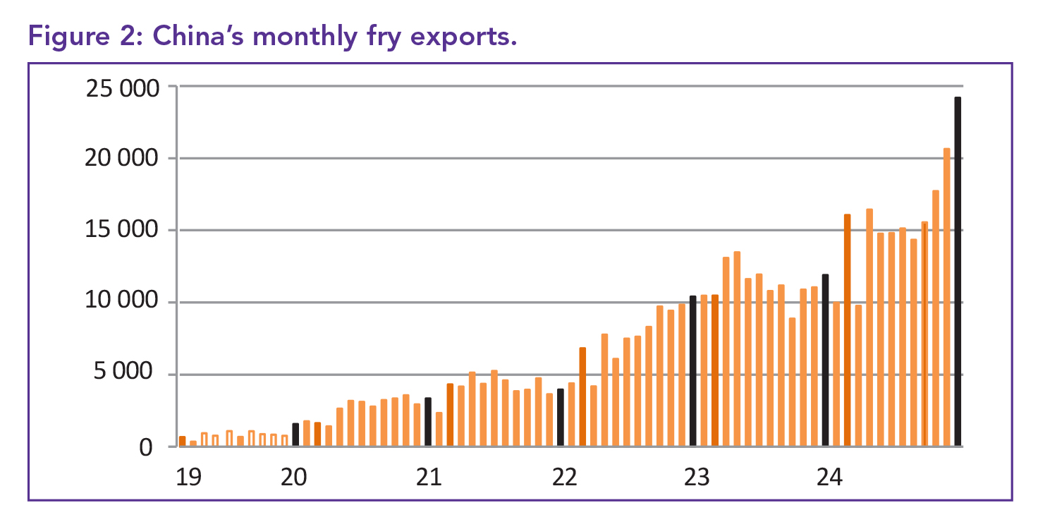 In November last year, New Zealand’s fry exports to Australia exceeded imports for the first time in eight months, marking its best monthly export figures since June last year. New Zealand exported 3 877 tonnes of fries, 852 tonnes more than October last year, though still 4% lower than 2023. Australia’s imports were 1 561 tonnes, the highest since March last year at $NZ2 077/t (US$1 166 or R21 400/t; €1 123/t), NZ$112 (R1 180) higher than October last year. Despite a 32.2% drop in volume, the higher price meant earnings were only down by 18.6%.
