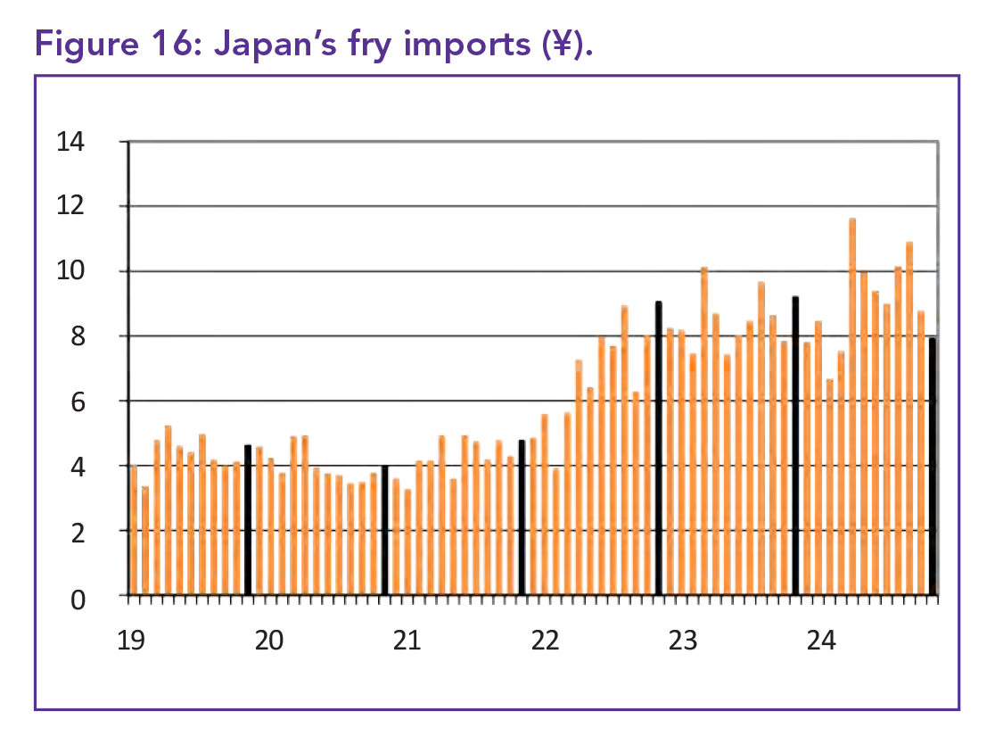 Buyers in Japan are weary because of rising inflation with fry imports to Japan dropping for the second consecutive month in November last year, reaching 30 019 tonnes as inflation concerns grew. Japan’s annual inflation rate rose from 2.3 to 2.9%, with food prices increasing by 4.5%. November last year’s imports of processed potato products were 8.3% lower compared to the same month in 2023.