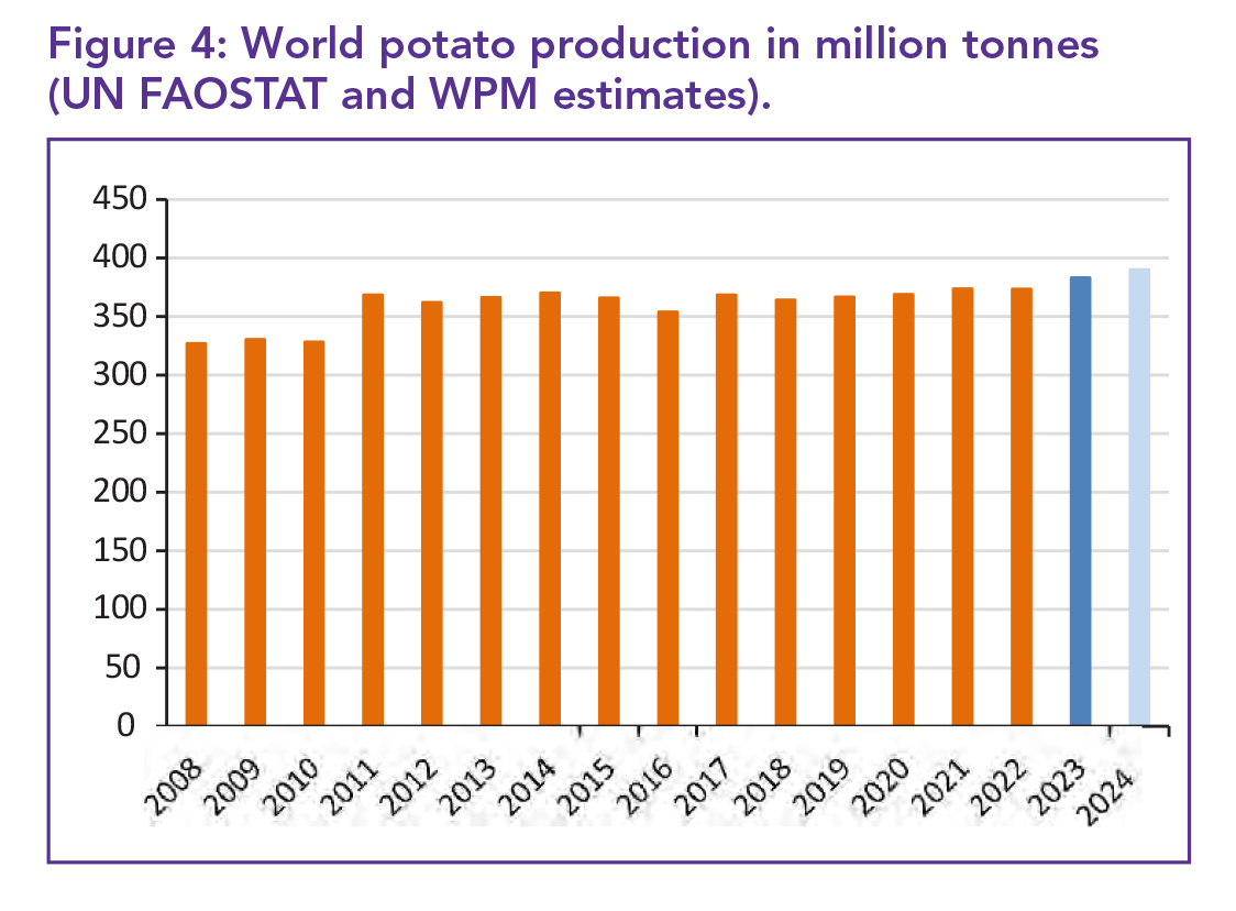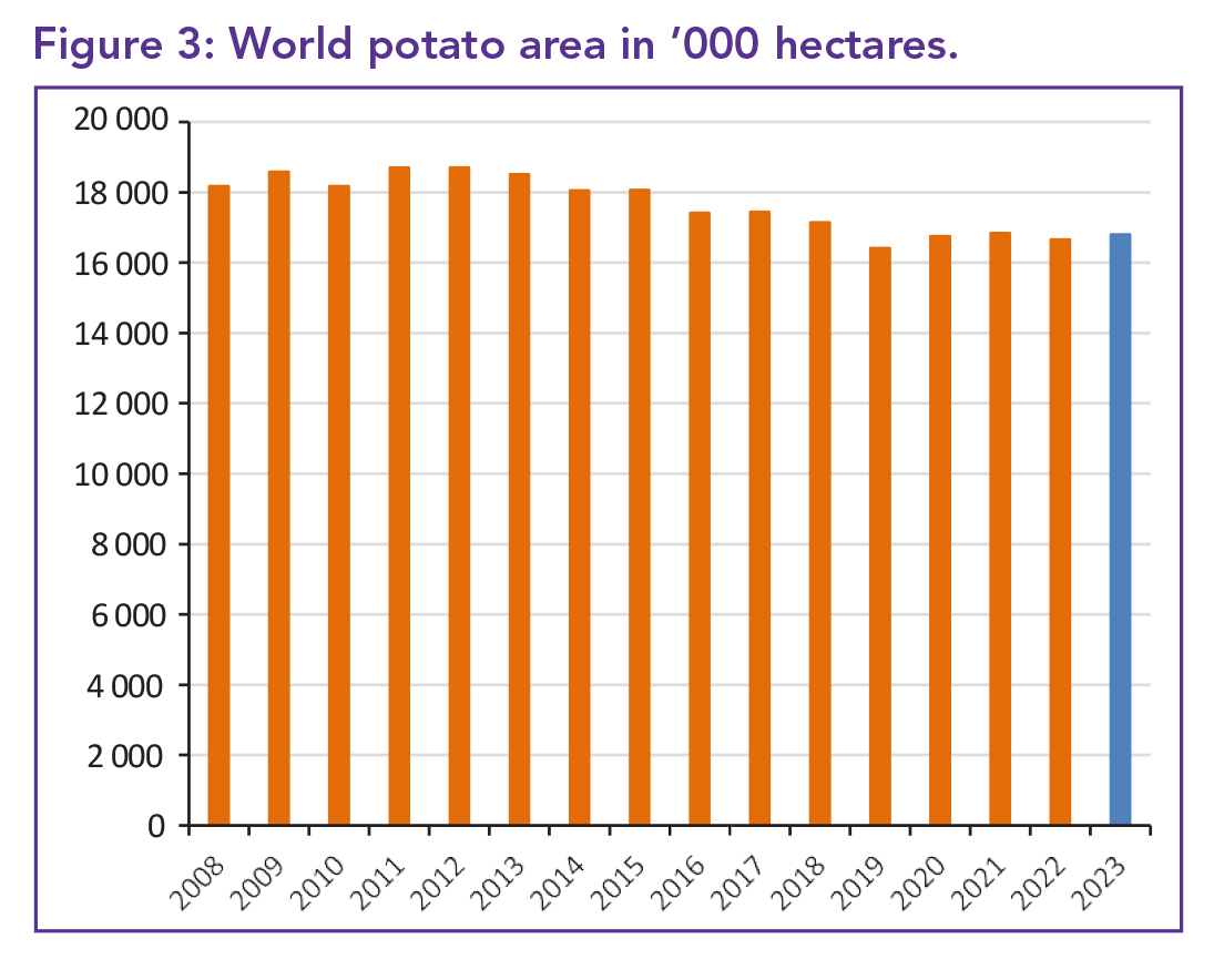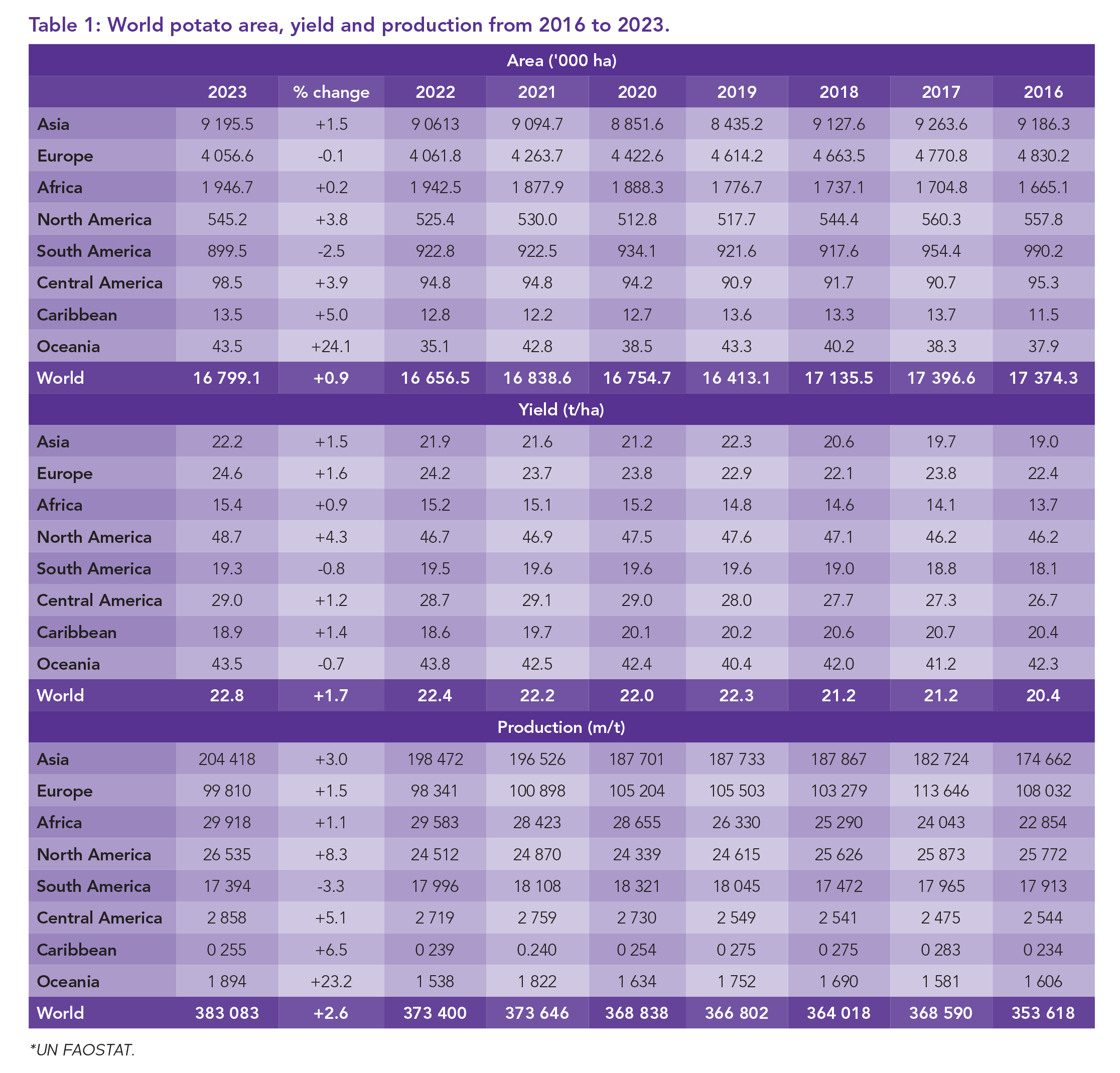 Asia remains the largest potato growing continent at 204.4 million tonnes. Europe’s potato growing areas were marginally down, but output was up 1.5% to almost 100 million tonnes. African potato production was at a record 29.918 million tonnes, 1.1% more than 2022. Oceania experienced the highest production growth rate (+23.2%), totalling 1.894 million tonnes. North America rebounded from previous declines, increasing production by 8.3% to 26.5 million tonnes, while South America was the only region to see a production decline, down 3.3% from 2022.