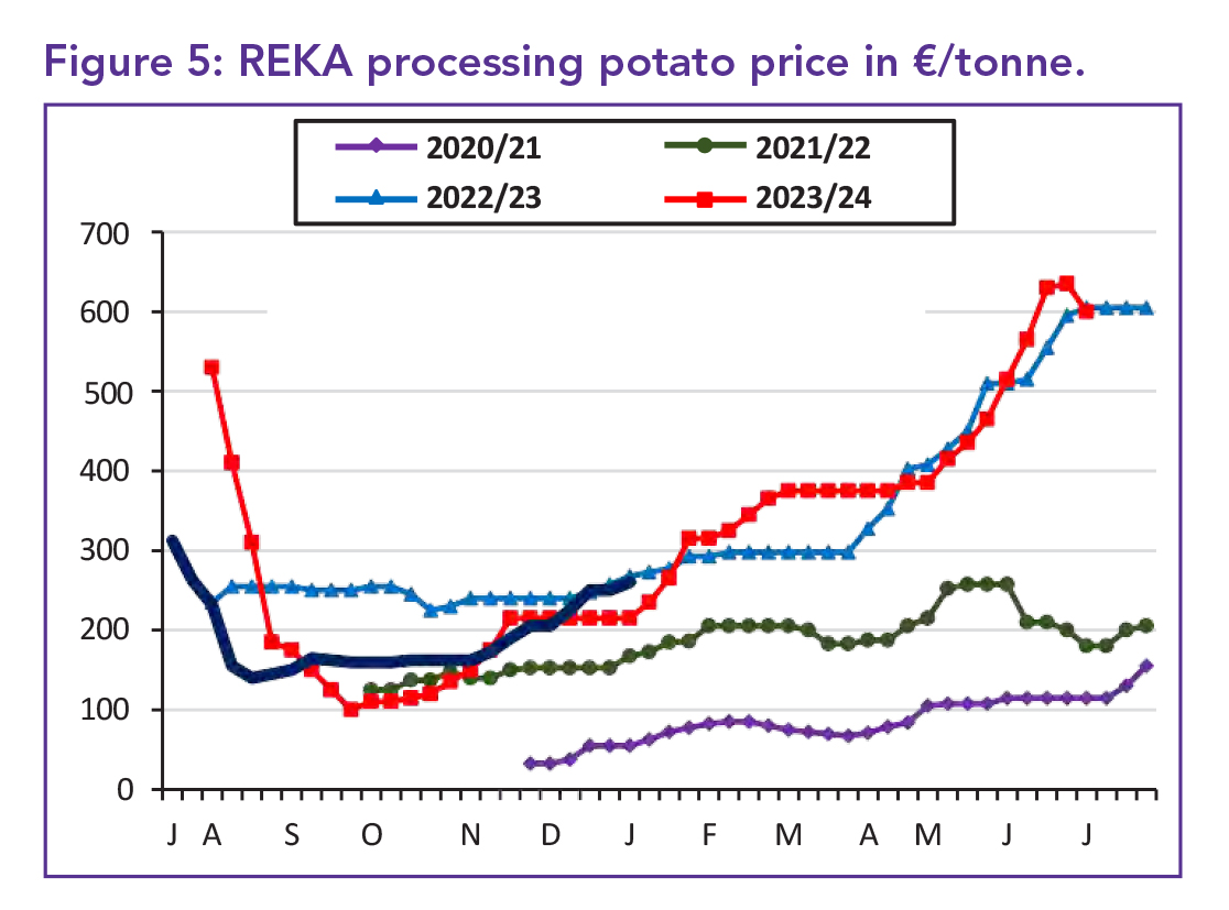 Potato prices are likely to rise within the next few months due to strong demand and limited supply. The first price quote of the year by German organisation REKA showed prices in the range of €210 to €310/t (R4 032 to R5 939/t) with an average of €260/tonne (R4 981/t), which is €10/t (R192) higher than pre-Christmas levels and €45/t higher year-over-year.