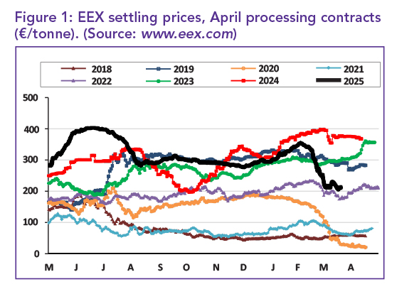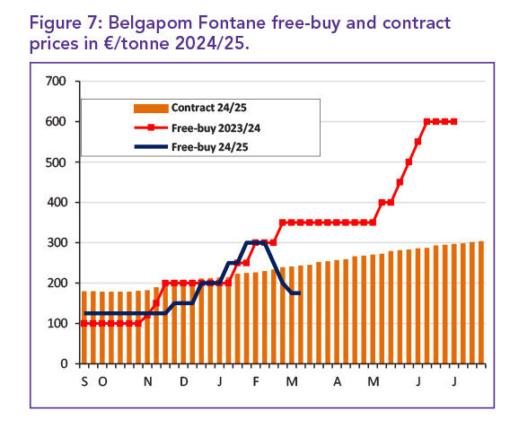 Free-buy prices remained below the past three seasons’ March levels, although they were still €125/t higher than March 2021, when the market was hit hard by Covid-19 (Figure 7).