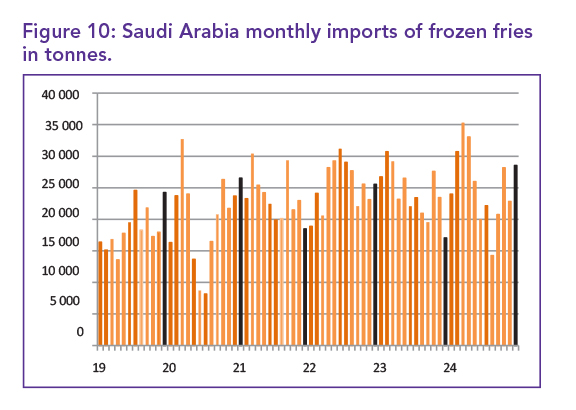 In December, Saudi Arabia imported 28 530 tonnes of frozen fries – the highest monthly volume since April and up 67.4% from a year ago (Figure 10).