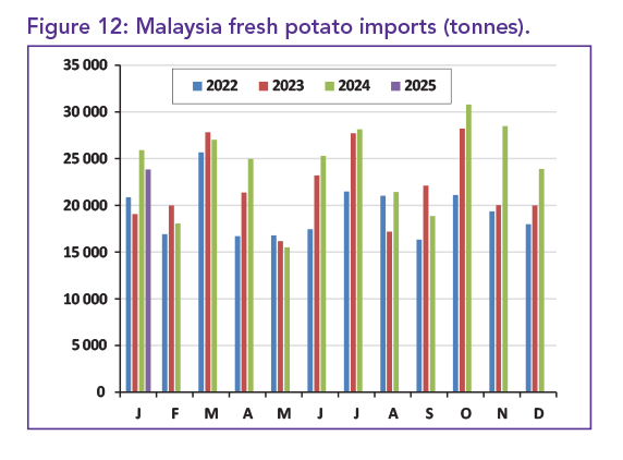 Malaysia’s total annual fry imports rose 15.5% to 98 833 tonnes in January, but remain 5.5% below the previous year’s consumption. The price reductions and boost in imports may stimulate continued demand, but future trends are uncertain. Fresh potato imports (Figure 12) held steady at 23 883 tonnes, with China supplying nearly 79% at MR 1 504/t (US$338), and Germany providing 2 573 tonnes at MR 2 272/t (US$511).