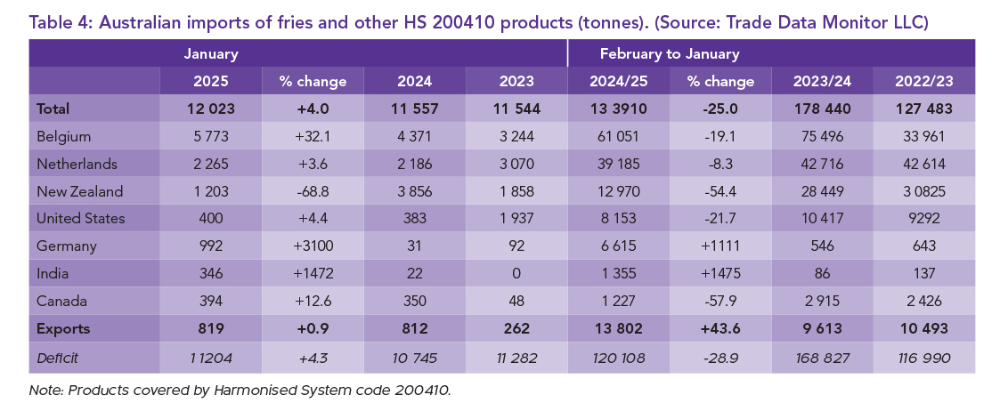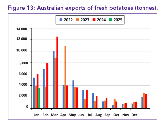 The Australian potato harvest finished in January, pushing exports of processed fries to 1 052 tonnes, a 29.5% increase from last year. Exports went mainly to New Zealand (819 tonnes) and the Philippines (211 tonnes).