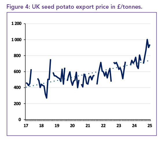 The UK allows some direct EU seed potato imports, which have surged 155.8% to 5 897 tonnes in seven months, with January alone up 50.2% to 2 847 tonnes. The Netherlands dominates supply. The average import price in January was £904/t, £46/t lower than the export price (Figures 3 and 4).