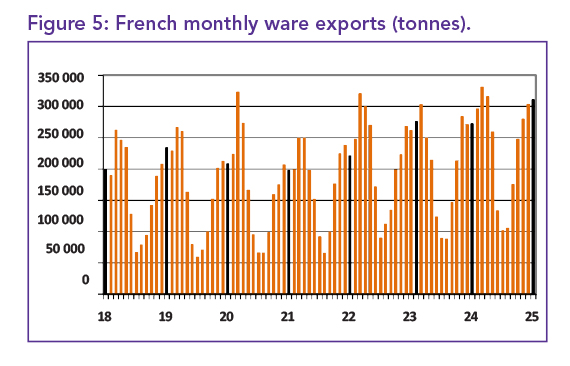 French fresh potato exports remained strong in January, reaching 310 485 tonnes – 13.9% higher than a year ago and the highest monthly total since April last year (Figure 5). Over seven months, exports rose 12.7% to 1 539 million tonnes, with sales valued at €519,6 million, up 9.4% despite a 7.9% drop in average prices (€339/tonne).