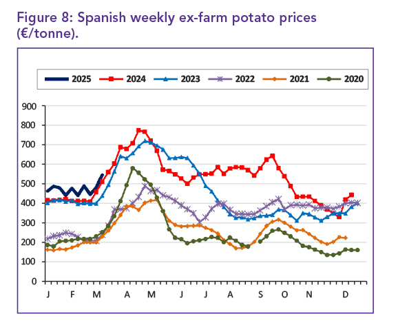 Ex-farm potato prices jumped 13.5% in early March to €545.30/t – 6% higher than the same week last year (Figure 8).