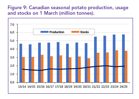Processed stocks were 1.93 million tonnes (-3.1%), fresh table stocks fell to a three-year low of 470 000 tonnes, and seed stocks dropped slightly to 407 000 tonnes (Figure 9).